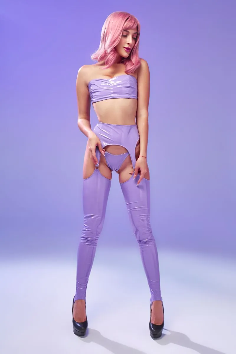Игривый сиреневый комплект из винила, блестит как вкусная сосательная карамелька. Наденьте его и пусть мужчина соблазнится вашим образом сладкой конфеты со вкусом БДСМ.