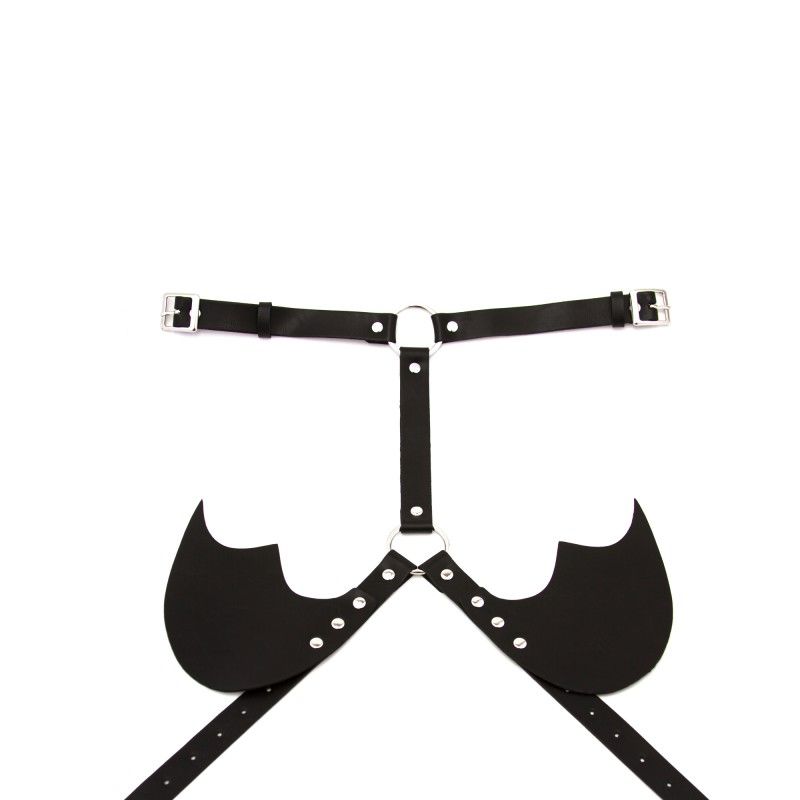 Портупея с маленькими аккуратными крылышками летучей мышки за спиной. Можно надеть на голое тело и внести в любовые игры элмент БДСМ! А можно надевать поверх любой одежды для создания образа для вечеринки или просто как аксессуар. Размер регулируется ремешками.