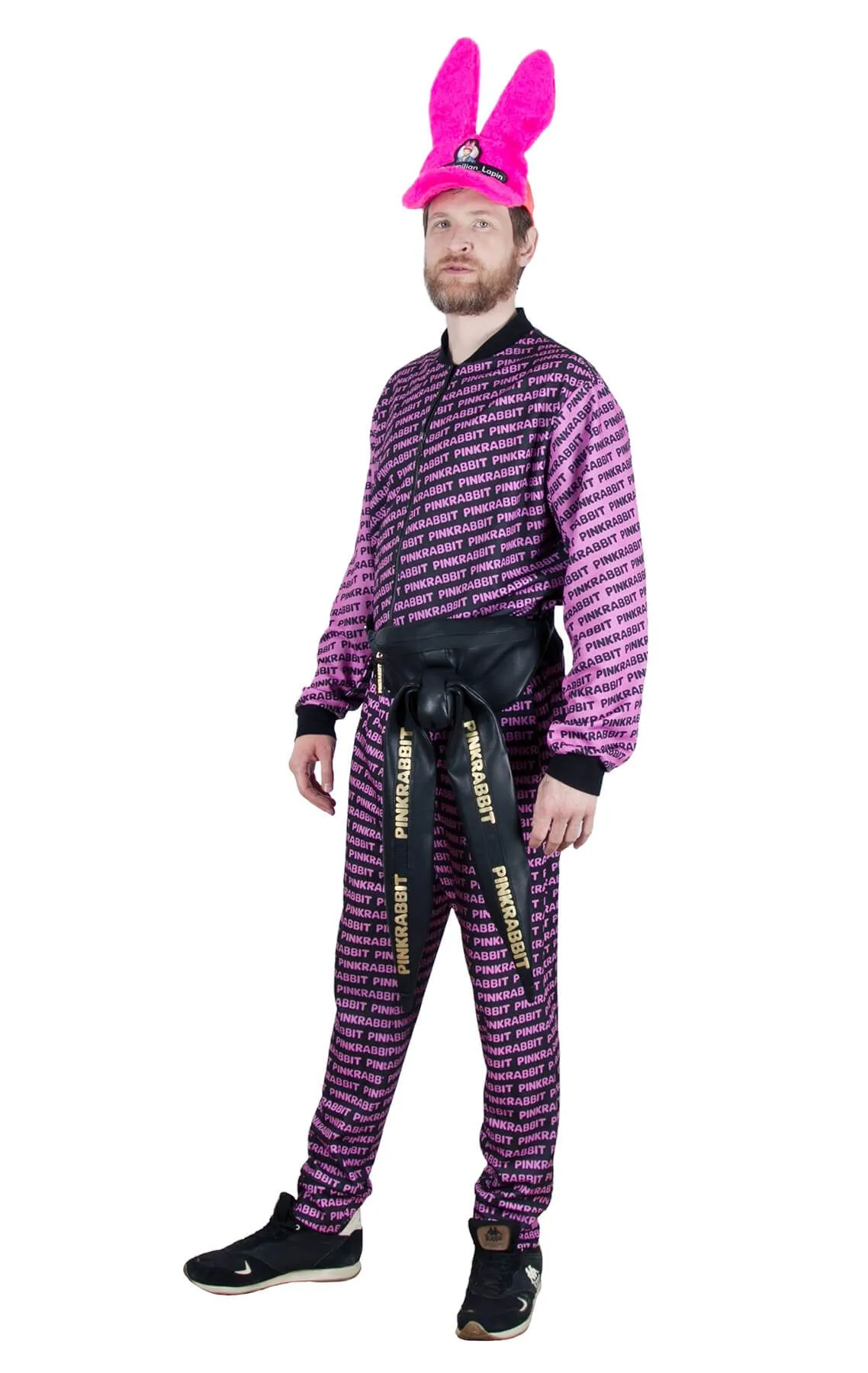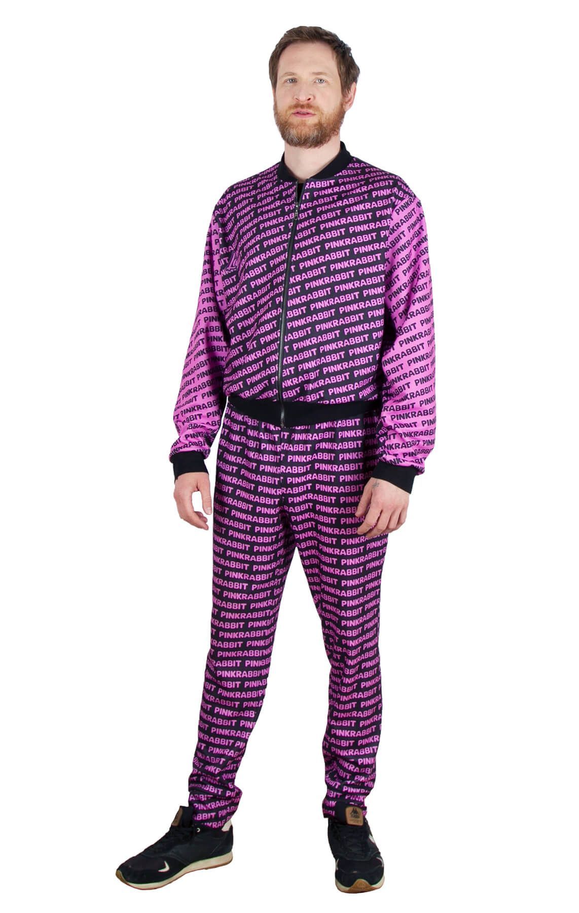 Стильный чёрный костюм с оригинальным розовым принтом от "Pink Rabbit" - это стильное решение на каждый день. Состоит из легкой толстовки на молнии и штанов. Наш фирменный принт делает костюм единым целым и подчеркивает вашу индивидуальность. Для домашнего вечера идеально подойдёт мягкий и гладкий материал костюма. А любители спорта оценят эластичные, не стесняющие движений резинки. Легко стирается и не мнётся, сохраняет форму и не растягивается. Стойкий цвет надолго оставит костюм таким же ярким, как и в первый день покупки.