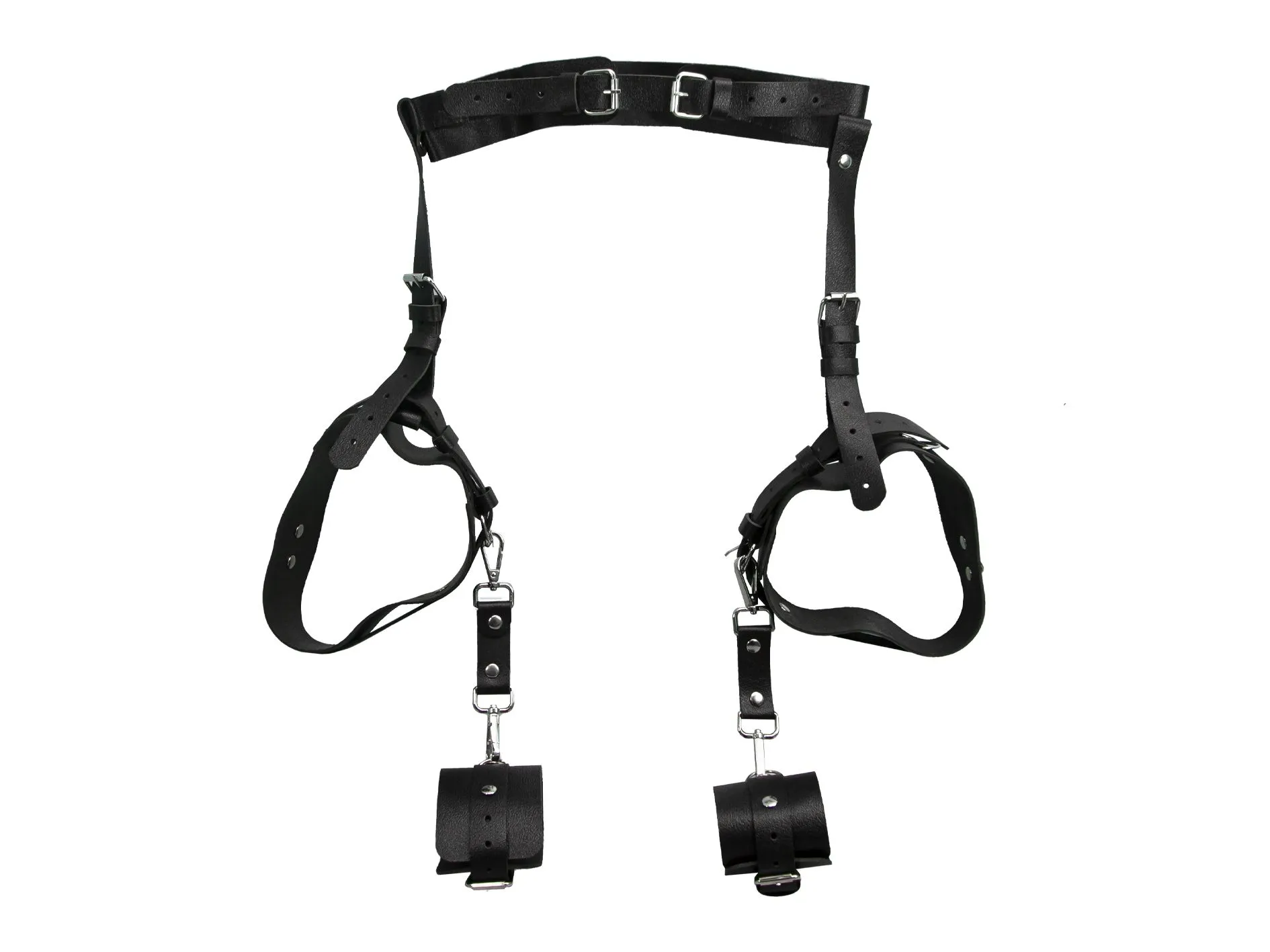 Позволь себе немного больше! Кожаный пояс с гартерами и наручниками, качественная фурнитура серебряного цвета, все детали регулируются по длине или ширине, наручники на карабинах, их можно отстегнуть и перестегнуть.