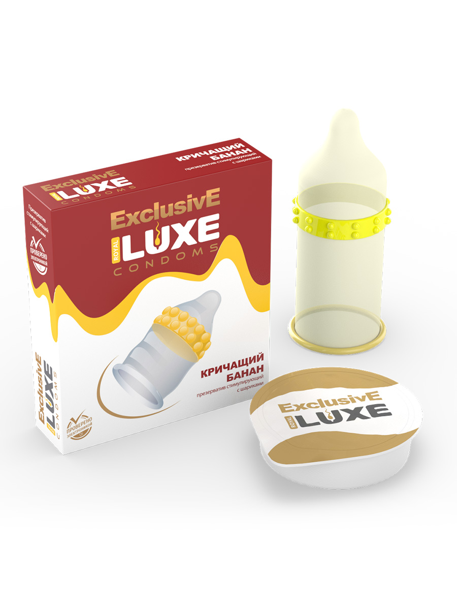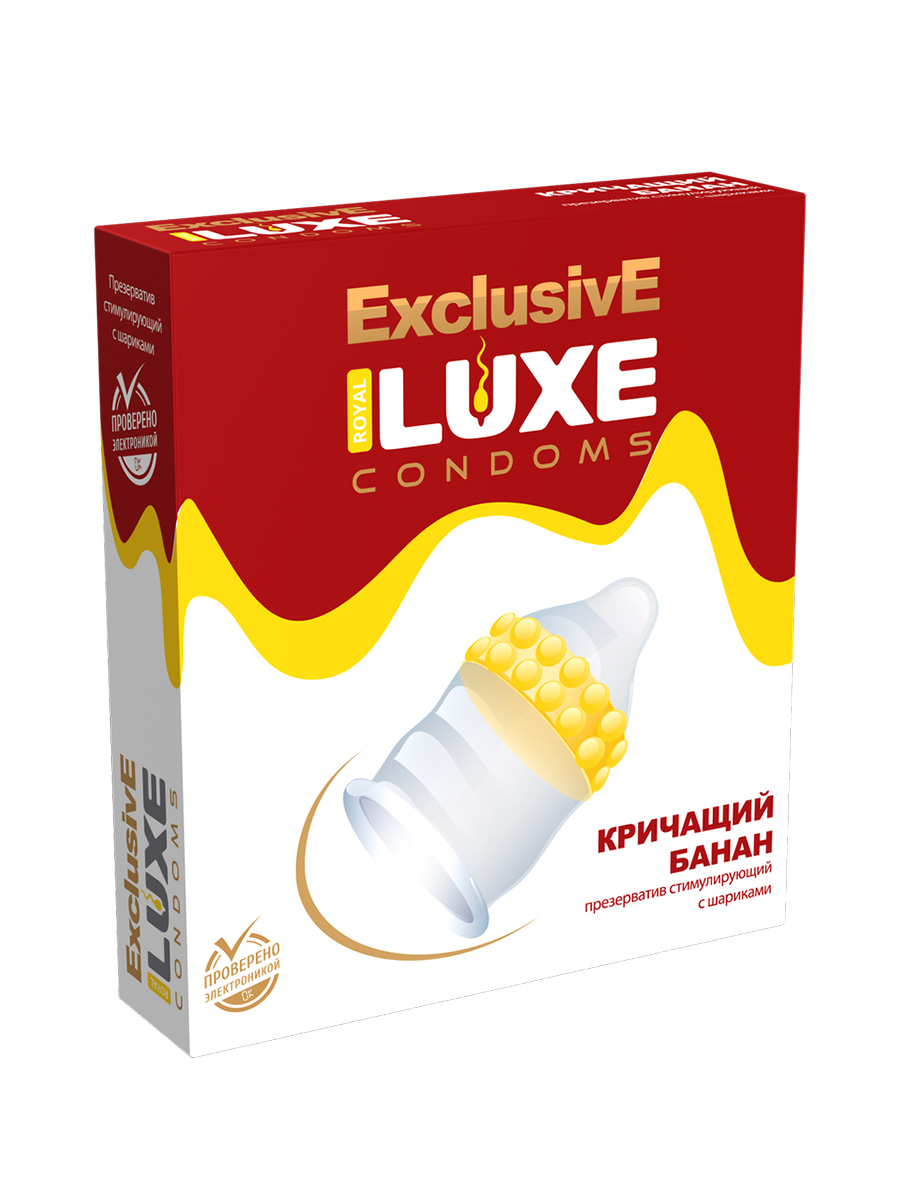 Презерватив «Кричащий банан» из серии Exclusive от бренда Luxe снабжен двойным рядом пупырышек на головке, который обеспечит невероятно приятную и волнующую стимуляцию эрогенных зон во время интимной близости. С таким необычным презервативом интимная близость заиграет новыми красками и станет более чувственной.