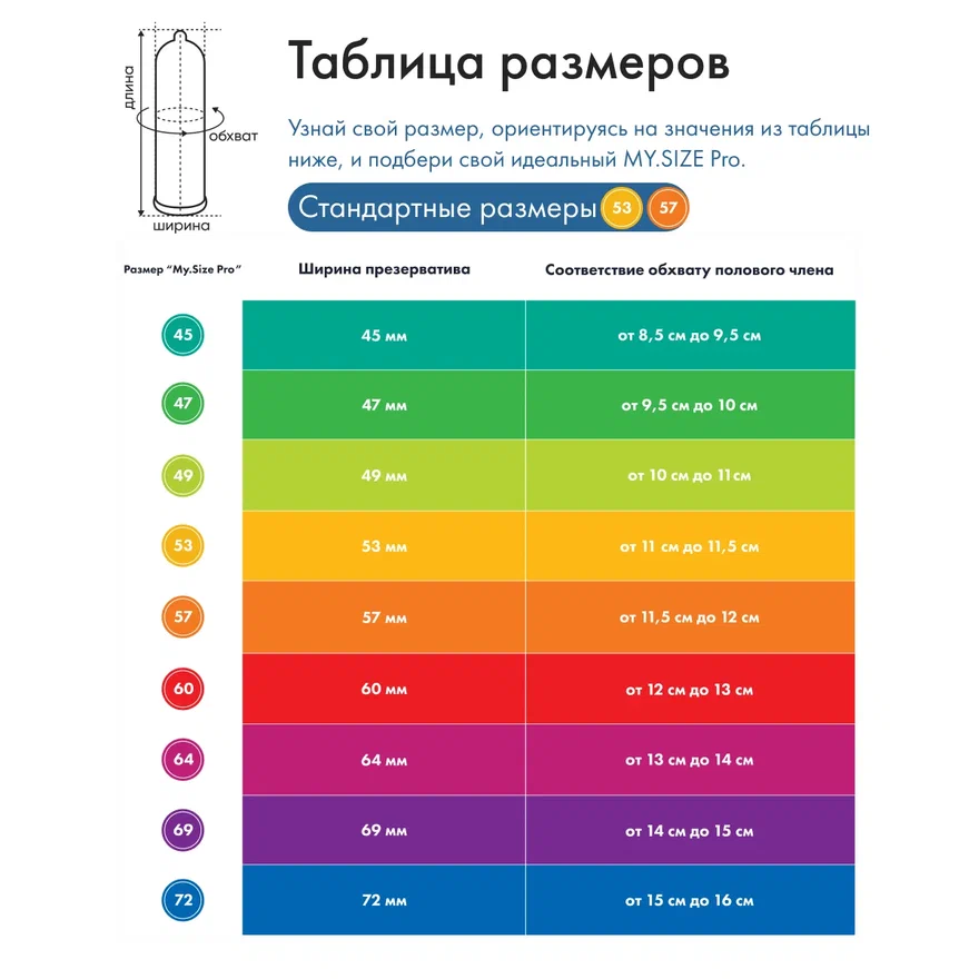 Чтобы удовольствие от секса было максимальным, ничто не должно мешать Вам наслаждаться друг другом. Большая часть презервативов выпускается в одном размере, в то время как размеры пениса у разных мужчин сильно отличаются. Немецкая компания R&S создала серию презервативов My.Size, отличающихся друг от друга размером, чтобы каждый смог подобрать идеальную для себя защиту. С презервативами My.Size Вы можете быть полностью уверены в своей безопасности и наслаждаться максимальной естественностью ощущений.