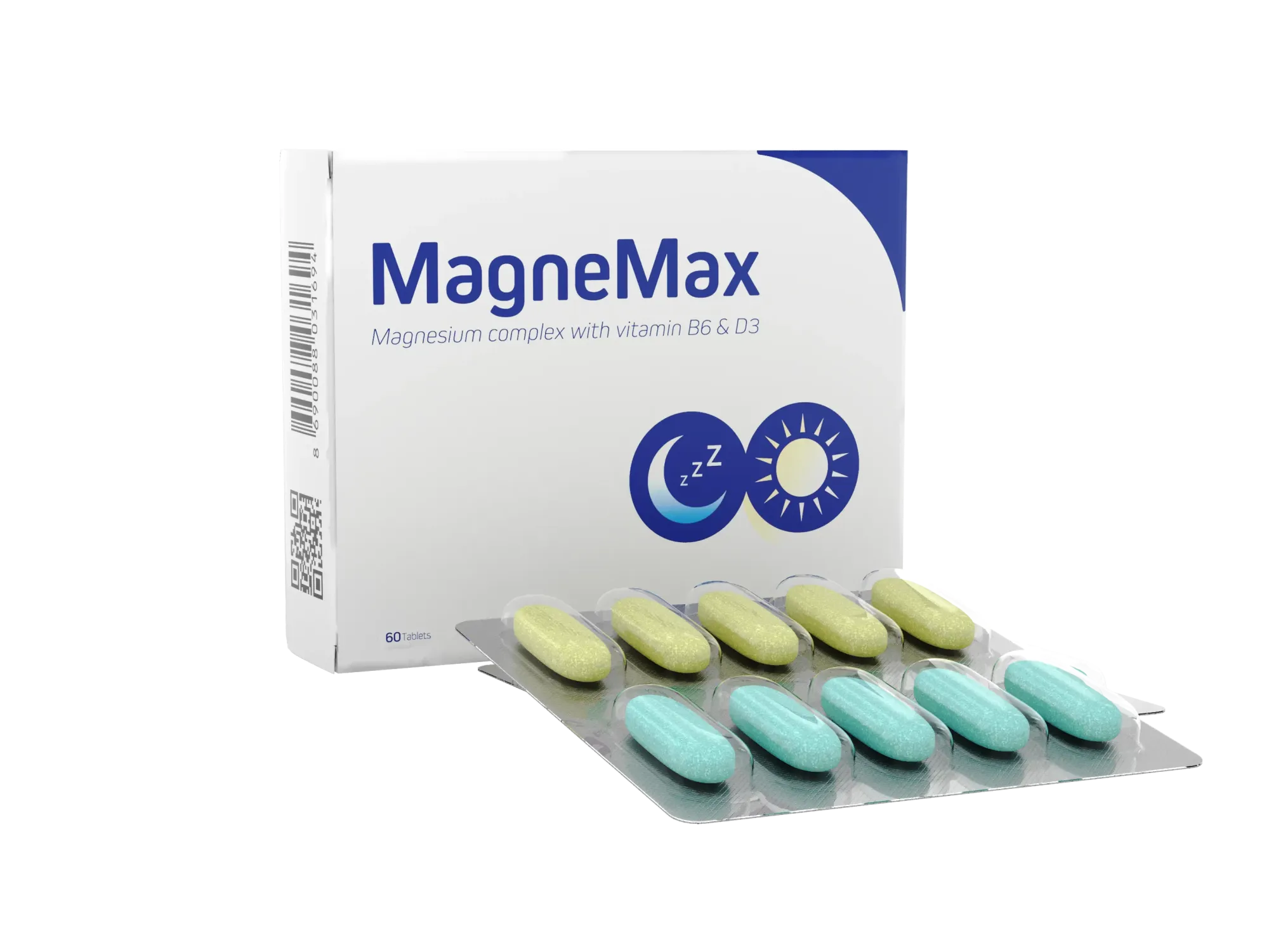 магния бисглицинат, микрокристаллическая целлюлоза (E460i, носитель), лактоза моногидрат, крахмал кукурузный, поливинилпирролидон (E1201, стабилизатор), магниевая соль стеариновой кислоты (E470, антислеживающий агент), бриллиантовый голубой FCF (E133, краситель), плёночная оболочка (гидроксипропилметилцеллюлоза (E464, загуститель), кальция сульфат (E516, носитель), магния карбонат (E504, регулятор кислотности), гидроксипропилцеллюлоза (E463, загуститель), жирные кислоты (E570, стабилизатор), полиэтиленгликоль (E1521, носитель), витамин B6 (пиридоксина гидрохлорид), витамин D3 (холекальциферол)