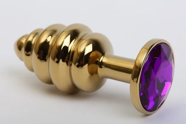Анальная пробка фигурная золото с фиолетовым стразом 8х3,5см 47473-5MM