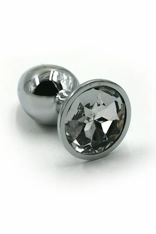 Анальная пробка из аллюминия размер M. Длина - 7 см, диаметр - 3,4 см, вес 82,5 грамма. Страз в основании круглой формы, выполнен из прозрачного стекла. Упакована в вельветовый мешочек для хранения.