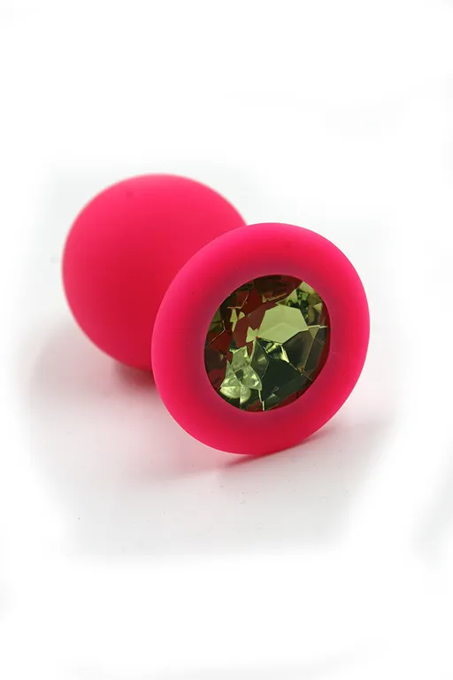 Анальная пробка из силикона розового цвета, размер M. Длина - 7 см, диаметр - 3,5 см, вес - 46,5 грамма. Страз в основании круглой формы, выполнен из стекла светло-зеленого цвета. Упакована в вельветовый мешочек для хранения.
