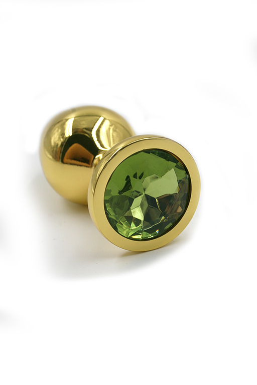 Золотая анальная пробка из аллюминия размер S. Длина - 6 см, диаметр - 2.8 см, вес в 52 грамма.Страз в основании круглой формы, выполнен из стекла светло-зеленого цвета. Упакована в вельветовый мешочек для хранения.