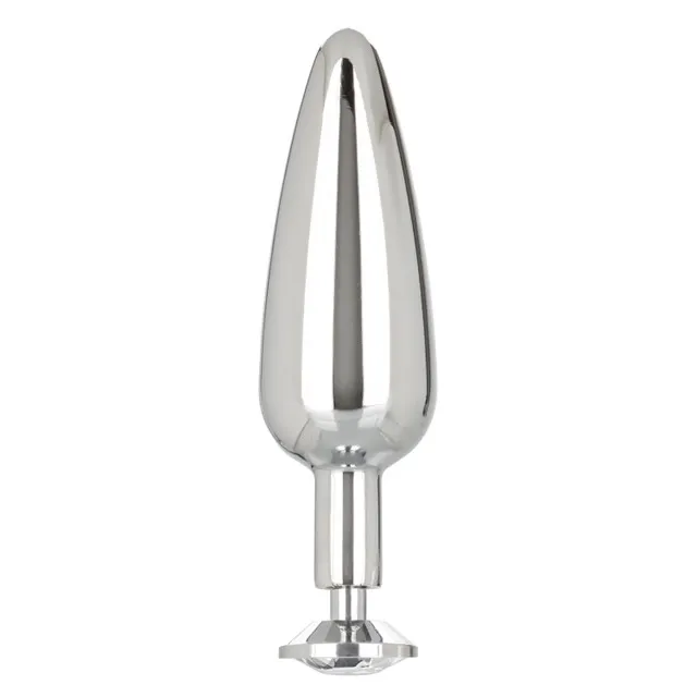 Литая анальная пробка имеет конусообразную форму. Гладкая фактура шлифованного металла создается вручную. Крупный граненный кристалл в основании имеет специальное светоотражающее покрытие дна для усиления блеска и более яркого и красочного вида.