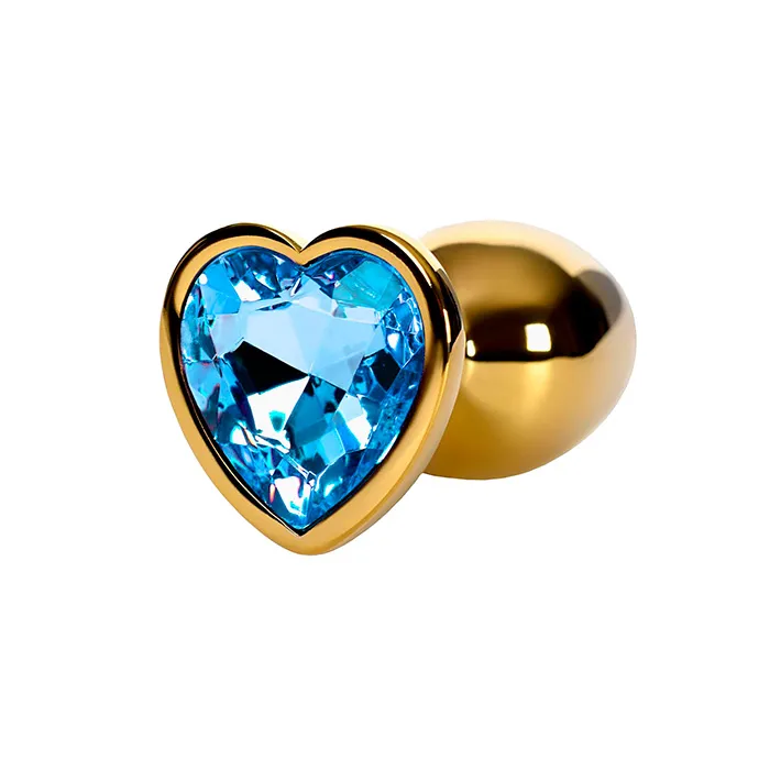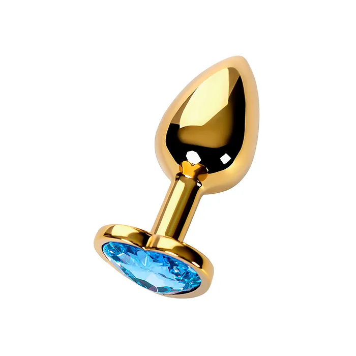 Анальная пробка PinkRabbit Maya металлическая с голубым кристаллом-сердцем, размер M, золотая