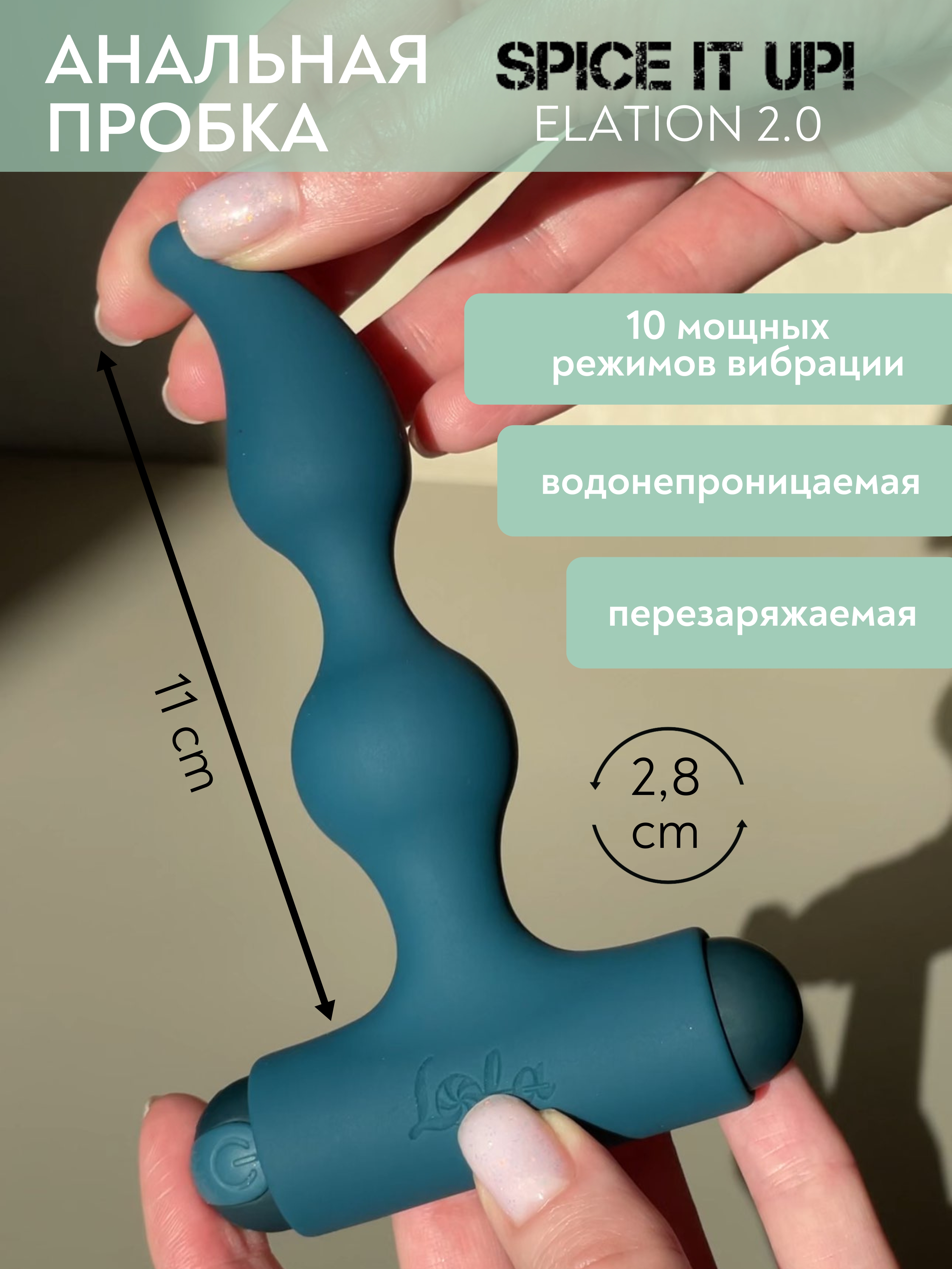 Анальная пробка Elation 2.0 с супер мощной перезаряжаемой вибропулей с 10 режимами вибрации – невероятно гибкая игрушка, которая подойдет как новичкам, так и тем, кто хочет добавить азарта в свои анальные игры. Благодаря анатомически правильно изогнутому кончику Elation 2.0 идеально подходит для массажа простаты. Изготовлена из гипоаллергенного силикона. Рабочая длина пробки составляет 11 см, а диаметр - 2,8 см. Перезаряжаемая вибриропуля изготовлена из пластика, не содержащего фталатов, имеет водонепроницаемость IPX7 и 10 режимов вибрации. Полностью заряжается за 80 минут. Работает без перерыва 175 минут. Длина пули - 7,6 см, диаметр - 2 см.