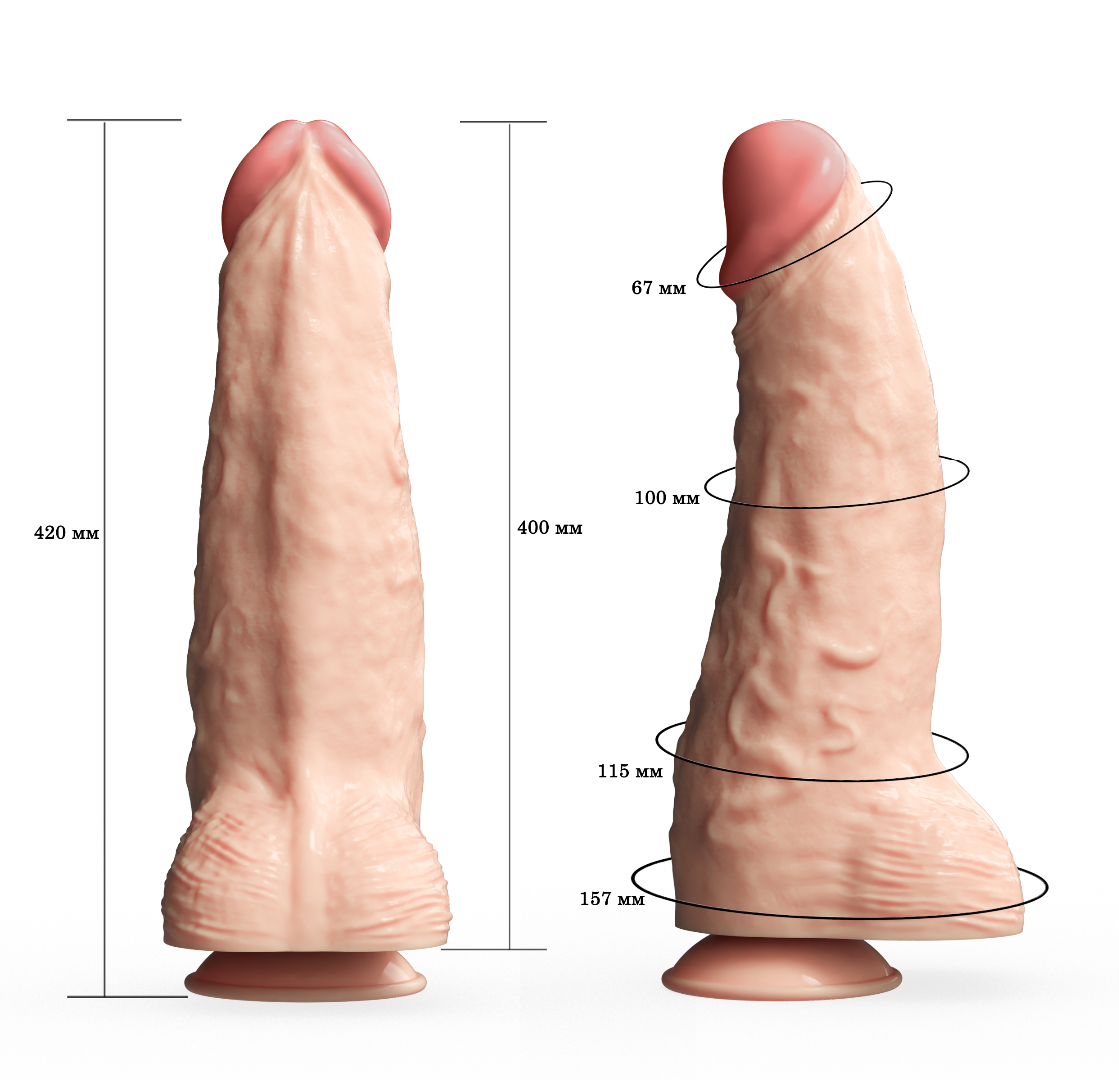 Искусственный фаллос гигантского размера.Фаллоимитатор из SEBS (TPR/TPI) и медицинского вазелинового масла. Изделие имеет многослойную структуру. Наружная оболочка сделана из мягкого материала NEOSKIN. Внутри каркас из более плотного, эластичного полимера. Фаллоимитатор полнотелый. Конусная форма с массивной нижней частью на мощной присоске. Головка относительно пропорций изделия уменьшена. Длина общая - 42см, длина рабочая - 33см, диаметр-11,5см, диаметр головки - 6,7см. Эротический атрибут.Все полимеры, пластификаторы и пигменты имеют пищевой класс безопасности. Товар сертифицирован.