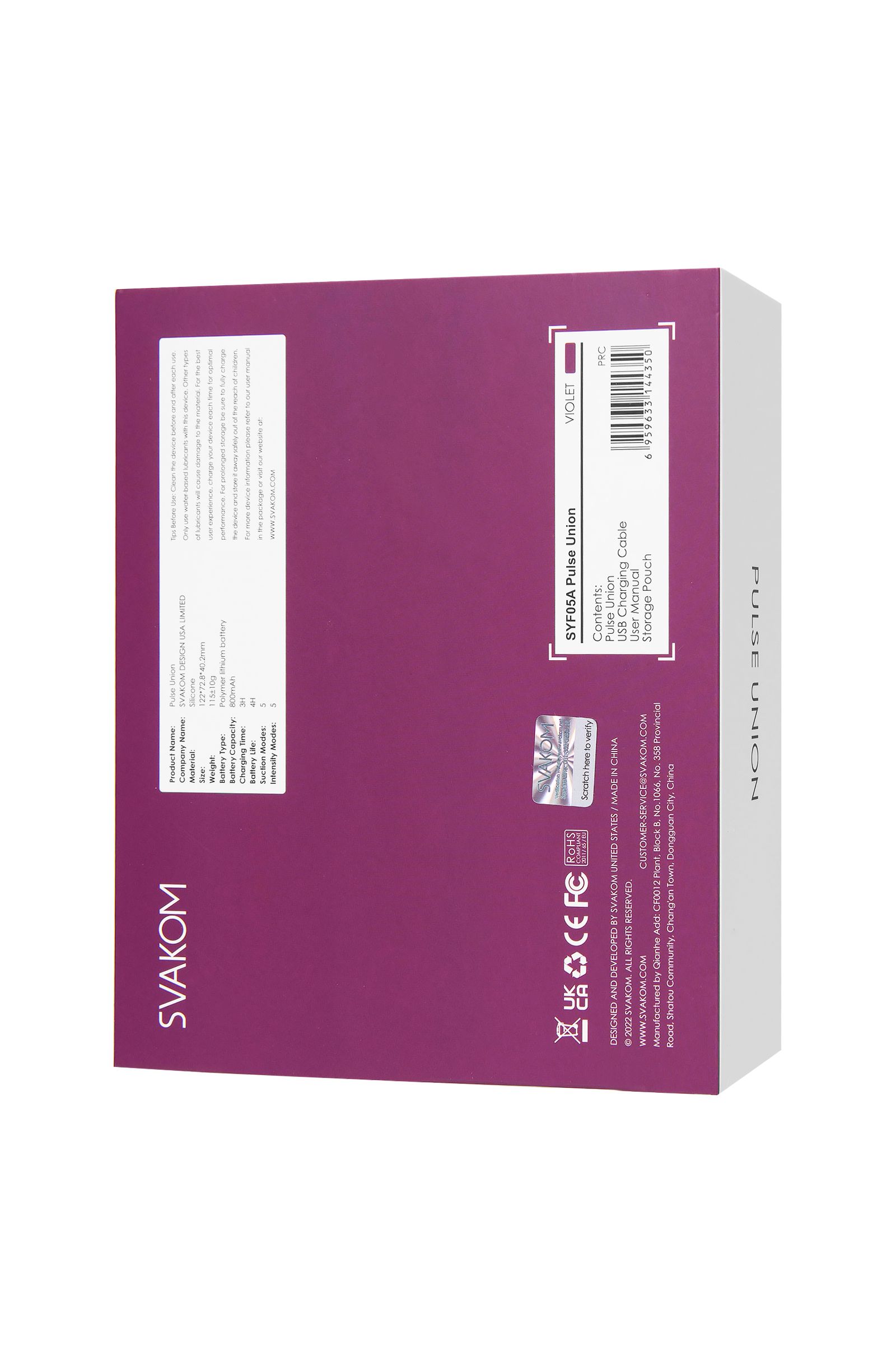 SVAKOM запатентовали новейшую технологию Pulse Technology™ и сейчас они рады показать вам, на что она способна. С ней вы испытаете самое глубокое удовольствие, которое вы когда-либо испытывали. Цветной дисплей Легко переключайтесь между 5 уникальными режимами вакуумной стимуляции. Для этого устройство оснащено динамическим светодиодным дисплеем, каждый режим имеет свой цвет. Память устройства Откройте для себя режим, который действительно заставляет вас двигаться вперед, и никогда не оглядывайтесь назад. Pulse Union переходит прямо в ваш самый последний режим каждый раз, когда вы включаете его и приступаете к делу. Путешествия Где бы вы ни находились, держите Pulse Union наготове. Используйте легкую компактную конструкцию в сочетании с Travel Lock для удобства и безопасности перемещения. Водонепроницаемость Возьмите Pulse Union в путешествие с влажным и сухим климатом. Игрушка полностью водонепроницаема, может быть использована везде, где бы вам этого захотелось. Наслаждайтесь простой и легкой очисткой.
