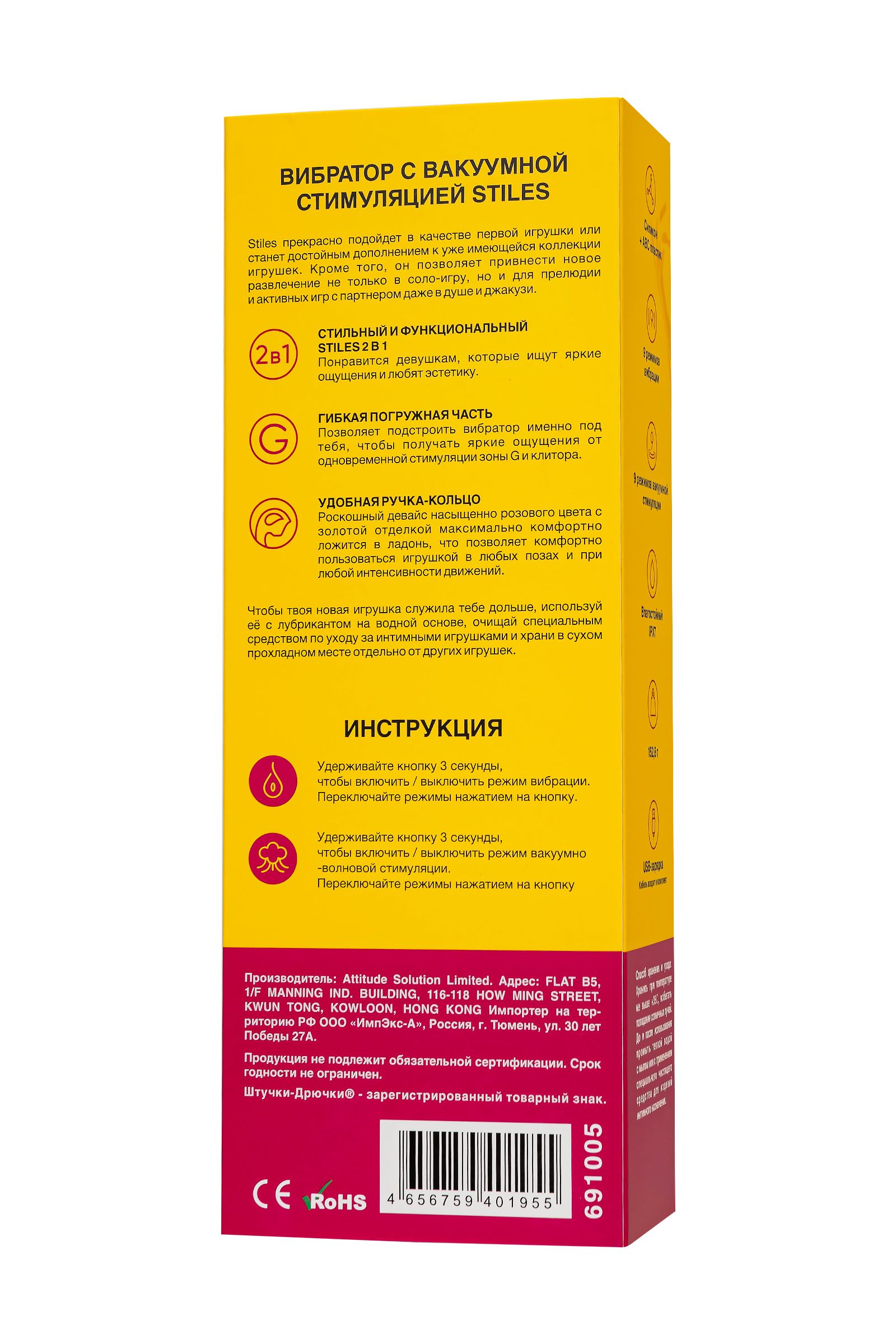 Стильный и функциональный Stiles 2 в 1 понравится девушкам, которые ищут яркие ощущения и любят эстетику. Нереалистичный вибратор с вакуумной стимуляцией Stiles имеет эргономичную форму и необычайно удобное ручку-кольцо, что позволяет комфортно пользоваться игрушкой в любых позах и при любой интенсивности движений. Гибкая погружная часть подстраивается именно под тебя, чтобы ты могла получать яркие ощущения от одновременной стимуляции зоны G и клитора. В твоем распоряжении 9 режимов вибрации, работающих отдельно от внешней части игрушки. Вакуум-волновой стимулятор бесконтактно воздействует непосредственно на клитор с помощью 9 режимов воздушных волн различной интенсивности. Используя одновременно два вида стимуляции ты воздействуешь на два мощнейших эпицентра женского оргазма, что непременно подарит тебе максимум удовольствия и по-новому откроет возможности твоего тела. Роскошный девайс насыщенно розового цвета и ручкой-кольцом с золотой отделкой максимально комфортно ложится в ладонь. Stiles прекрасно подойдет в качестве первой игрушки или станет достойным дополнением к уже имеющейся коллекции игрушек. Кроме того, Stiles позволяет привнести новое развлечение не только в соло-игру, но и для прелюдии и активных игр с партнером даже в душе и джакузи. Чтобы твоя новая игрушка служила тебе дольше, используй с лубрикантом на водной основе. Очищай специальным средством по уходу за интимными игрушками и храни в сухом прохладном месте отдельно от других игрушек. Заряжается Stiles магнитной зарядкой с USB-портом.