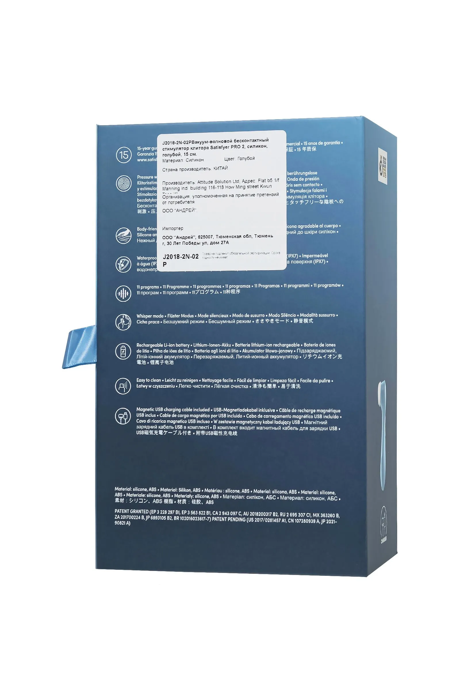 Корпус устройства изготовлен из высококачественного медицинского силикона, гипоаллергенного и приятного на ощупь. Усовершенствованная форма насадки обеспечивает идеальное прилегание, а сертификация IPX7 позволяет наслаждаться им даже во время водных процедур.