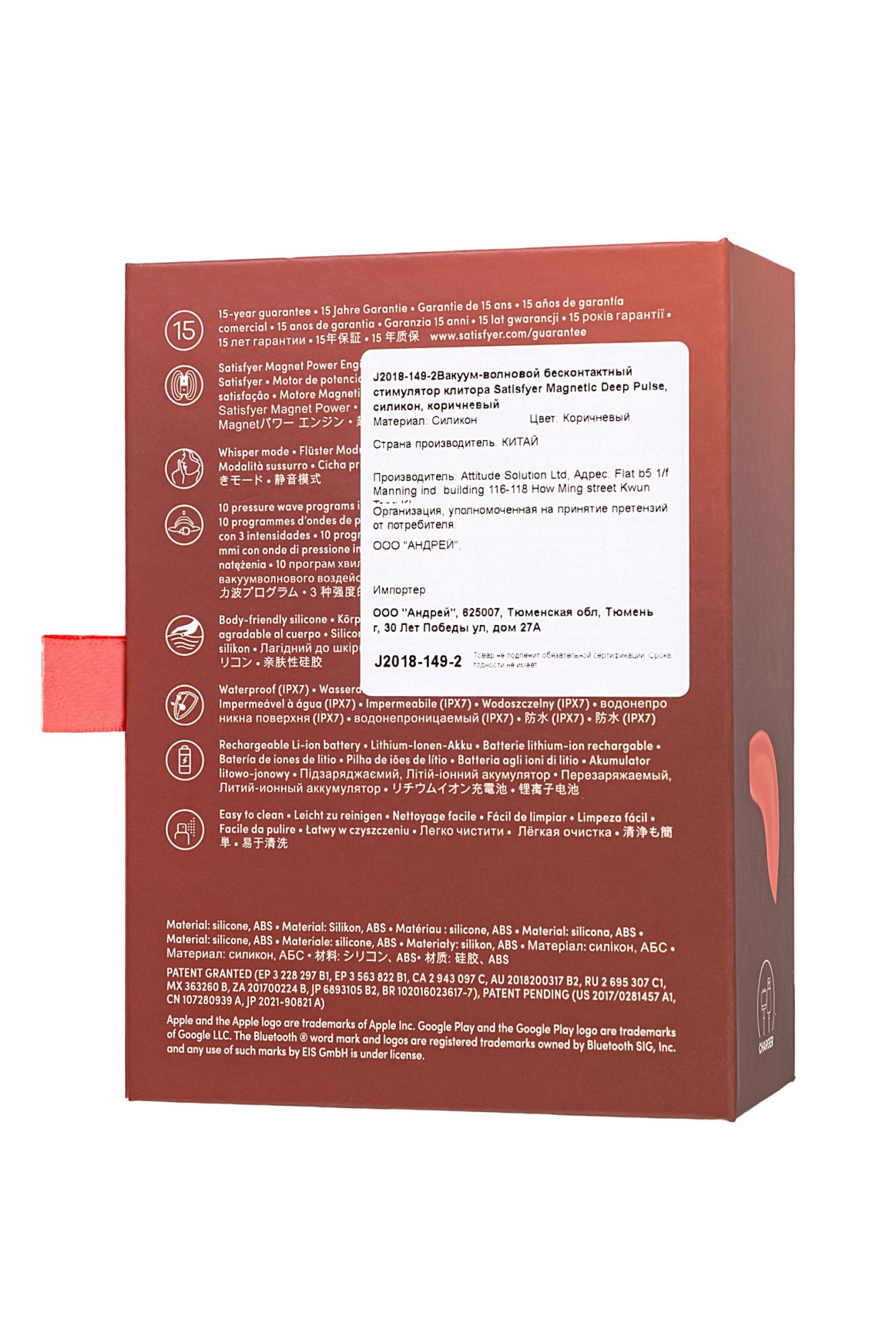 Добро пожаловать в мир истинного удовольствия и экстаза! Представляем вам Satisfyer Magnetic Deep Pulse – не просто игрушку, а настоящего искусителя, способного доставить вам незабываемые моменты наслаждения. С новой магнитной технологией этот клиторальный стимулятор стал еще тише, а волны импульсов – мягче и медленнее. Он создает нежные воздушные колебания, которые проникают глубоко внутрь, пробуждая вашу чувственность и даря невероятные ощущения. Уникальное сочетание запатентованной технологии Air Pulse и регулируемого положения мембраны дает вам еще больше возможностей для исследования вашего собственного удовольствия. Вы сами решаете, какую интенсивность испытать, регулируя расстояние мембраны до трех уровней. Чем ближе она к вам, тем сильнее ощущение волны давления. И это еще не все! Satisfyer Magnetic Deep Pulse предлагает вам 11 уровней интенсивности и 3 варианта интенсивности волн давления, что в сумме дает вам целых 33 комбинации наслаждения. Вы сами создаете идеальную комбинацию, чтобы достичь максимального удовольствия. Эргономичная форма позволяет удобно держать его в руке. Широкий раструб с мягкими краями ласково обнимает ваш клитор, создавая нежные и стимулирующие ощущения. Вы просто не сможете устоять перед его магическим прикосновением! Изготовленный из безопасного для тела силикона, Magnetic Deep Pulse обеспечивает мягкость и комфорт при каждом использовании. Он также водонепроницаемый по стандарту IPX7, что позволяет вам наслаждаться им во время романтического душа или расслабляющей ванны. Не упустите возможность испытать настоящий взрыв эмоций и удовольствия с Satisfyer Magnetic Deep Pulse. Эта новинка обязательно станет хитом! Попробуйте его и откройте для себя новые грани наслаждения. Ощутите настоящее удовольствие и эйфорию, которые оставят вас жаждущими еще больше! Особенности: Воздействие на клитор воздушной пульсацией Air Pulse Регулировка расстояния мембраны до трех уровней, что влияет на интенсивность Управление кнопками на корпусе, комфортно лежит в руке. 11 режимов вакуумной стимуляции и 3 уровня интенсивности Универсальный коричневый цвет и нежный, эластичный силикон без запаха, аллергенов и вредных веществ для здоровья. Компактный размер – 11,6 см. 100% водонепроницаемость - IPX7. Перезаряжаемый с помощью USB-кабеля.