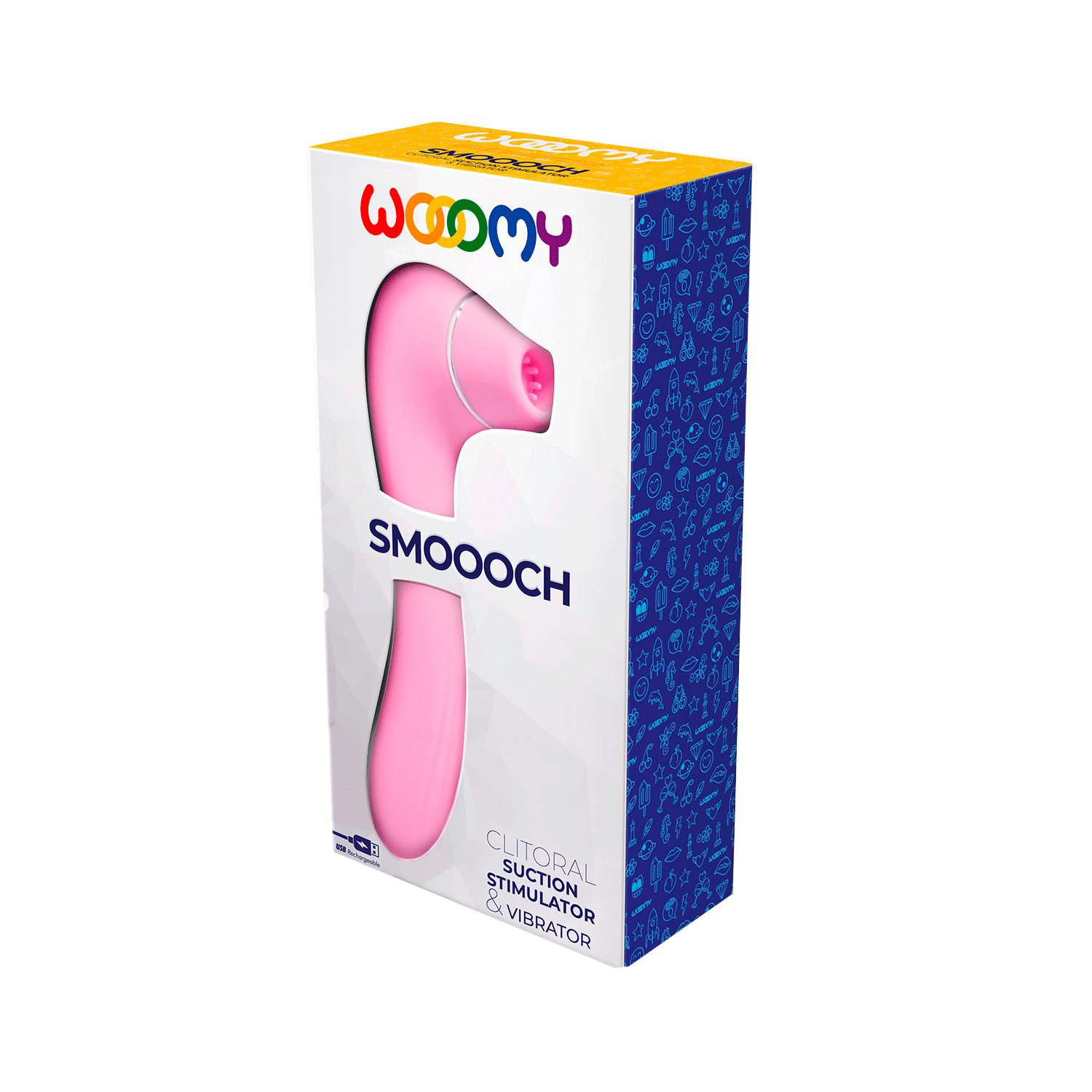 Стимулятор клитора Smoooch Pink розового цвета с двойной функцией. Изготовлен из силикона и ABS для комфорта. Длина — 18,6 см, диаметр — 4,5 см, вес — 230 г. Два мотора, 10 режимов вибрации и всасывания. Подходит для клитора и точки G. Водонепроницаемость IPX7 позволяет использовать в воде. Заряжается через USB. Уход: промыть водой с мылом.