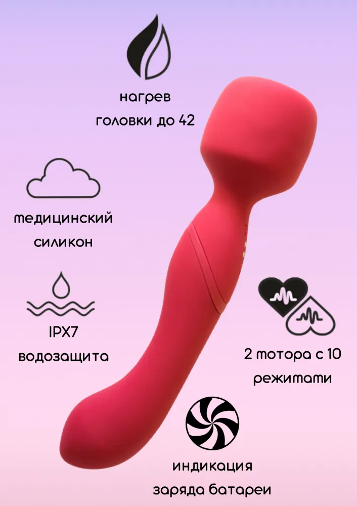 Двусторонний вонд изготовлен из гипоаллергенного силикона и полностью водонепроницаем. Два мощных перезаряжаемых мотора имеют по 10 режимов глубокой вибрации, а подвижная головка способна нагреваться до 42 градусов за 5 минут. Игрушка оснащена индикатором уровня заряда батареи - кнопки подсвечиваются, когда заряд достигает отметки в 15%. Подходит для массажа, а также эффективно простимулирует клитор и любые внешние эрогенные зоны. Проникающая часть идеальна для вагинальной и анальной стимуляции. Для включения удерживайте кнопку карамельки на передней панели игрушки 3 секунды. Когда игрушка включена, кнопки светятся. Стрелка наверх отвечает за мотор головки, стрелка вниз - за мотор проникающей части. Легкое нажатие стрелок переключает режимы вибрации. Кнопка нагрева в виде огонька расположена на задней стороне игрушки. Удержание в течении 3 секунд данной кнопки включает режим нагрева. Время зарядки: 180 мин. Время работы: 1 мотор - 95 мин, 1 мотор + нагрев, 2 мотора - 75 мин, 2 мотора + нагрев - 50 мин.