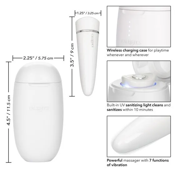 Этот массажер - первый в своем роде с футляром для беспроводной зарядки с магнитным соединением и индикатором заряда батареи. Встроенный УФ-дезинфицирующий свет очищает и дезинфицирует пулю в зарядном футляре за 10 минут.