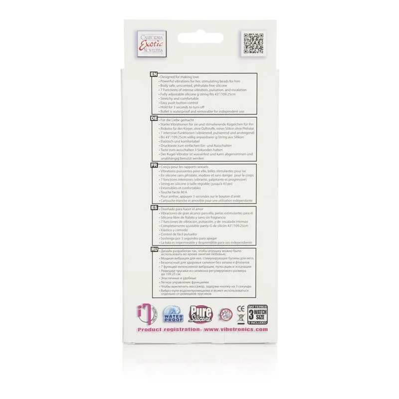Ремешок сделан из мягкого силикона и регулируется под разные размеры. Кольцо из бусинок создано специально для Него, а вибропуля с 7 функциями вибрации, эскалации и пульсации подарит Ей невероятное удовольствие. Вибропуля выполнена из пластика и полностью водонепроницаема, может использоваться отдельно от трусиков на любых частях тела.
