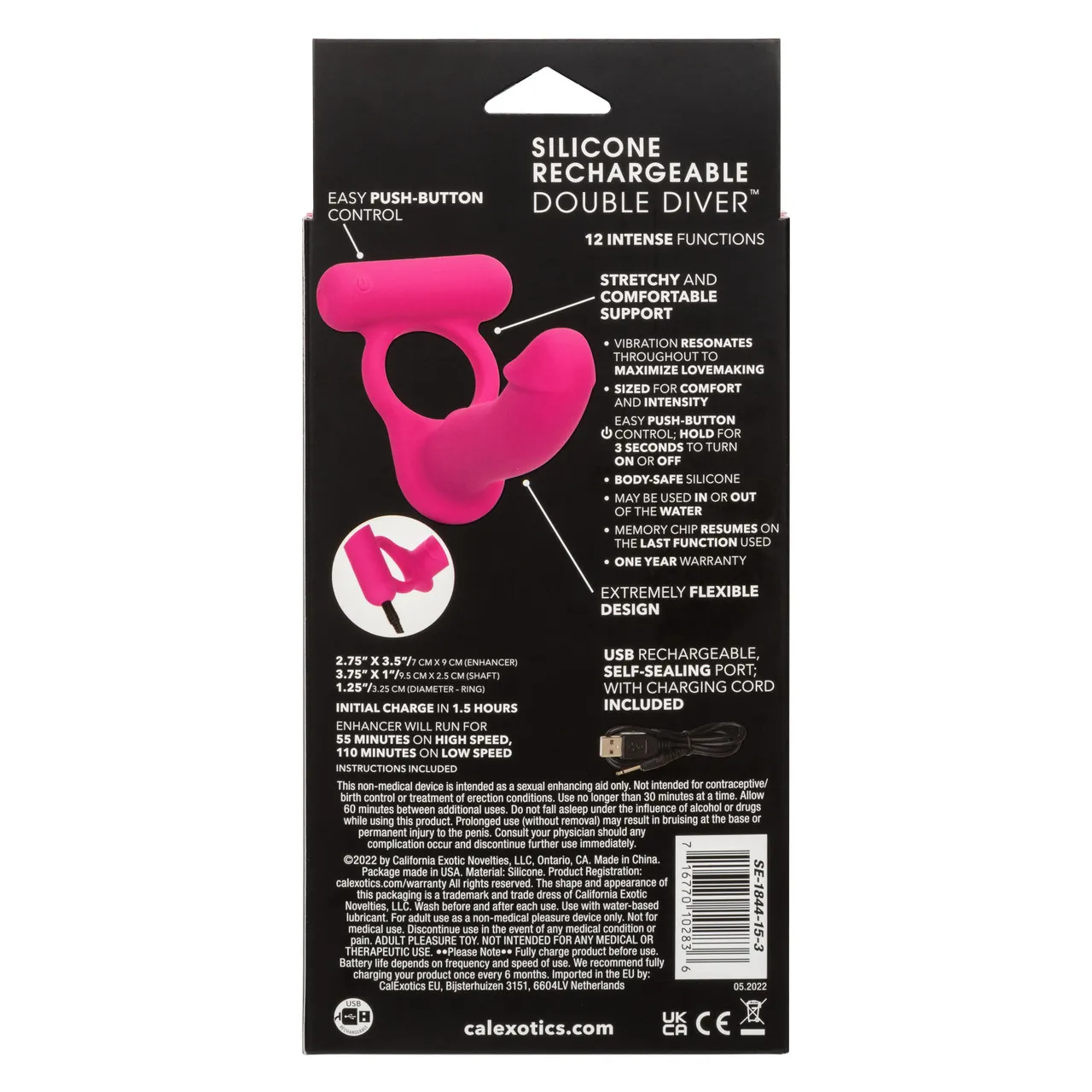 RECHARGEABLE DOUBLE DIVER – насадка на пенис с вибропулей, которая позволит насладиться двойным проникновением не привлекая еще одного партнера. Она имеет реалистичную форму с ярко выраженной головкой и рельефным телом. Насадка оснащена системой поддержки в виде эрекционного кольца с вибропулей для стимуляции партнера, что способствует усилению эрекции и предотвращению преждевременной эякуляции.
