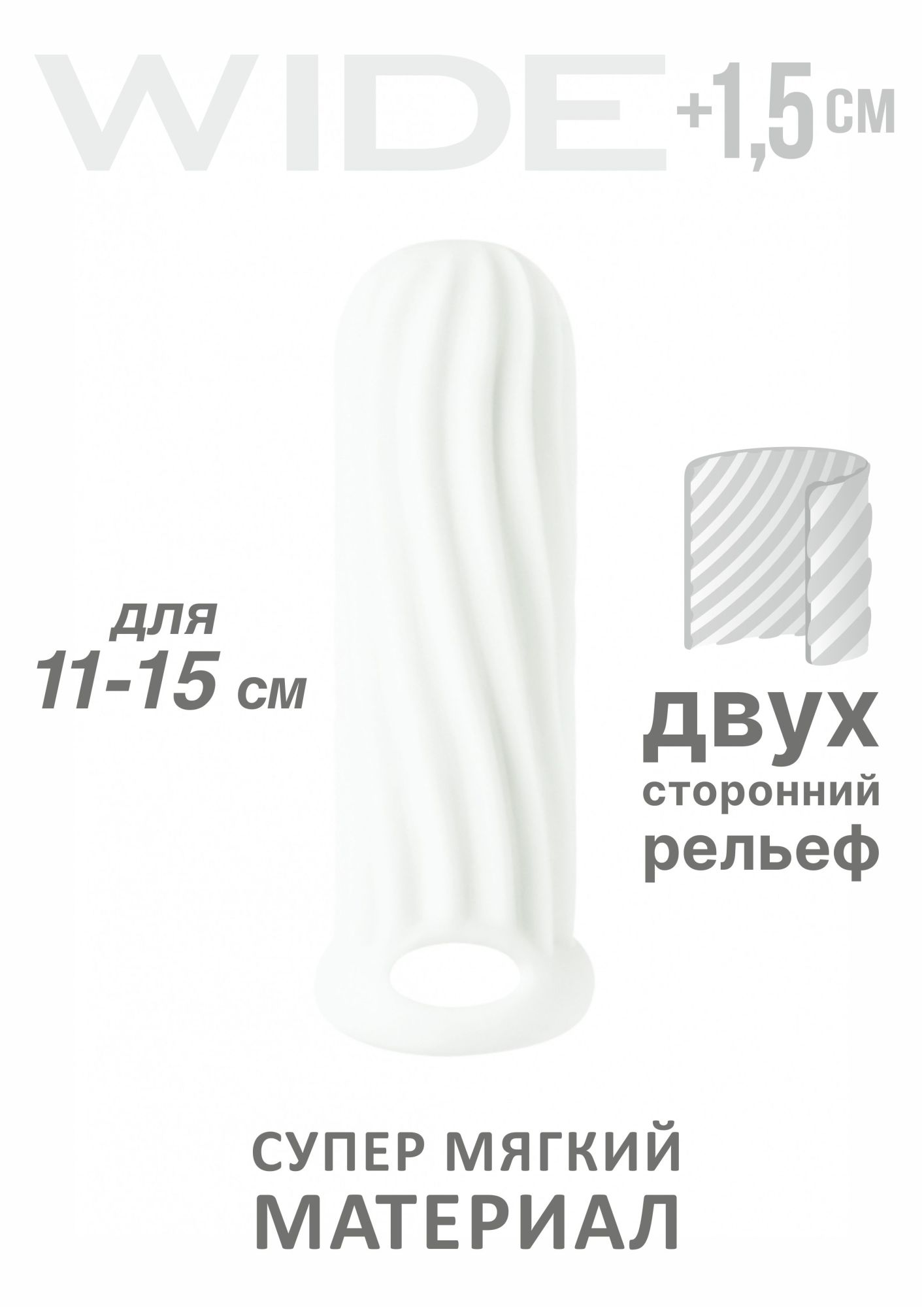 Насадка Wide коллекции Homme обеспечивает увеличение размера пениса в ширину. Материал насадки - гипоаллергенный, создающий имитацию мягкой и шелковистой «кожи» ТПЕ. Фиксирующее кольцо на мошонку не только удерживает фаллоудлинитель, но и благодаря сдавливанию может усиливать эрекцию. Двухсторонний нереалистичный рельеф насадки позволит одновременно стимулировать сразу обоих партнеров во время полового акта и дополнительно подарит приятные ощущения. Благодаря толстым стенкам, насадка увеличивает диаметр пениса до 1,5 см. Насадка отлично тянется, продлевает время интимной близости и компенсирует анатомическое несоответствие между партнерами. Материал ТПЕ, общая длина 13 см, длина внутреннего тоннеля 13 см, толщина стенки 7 мм