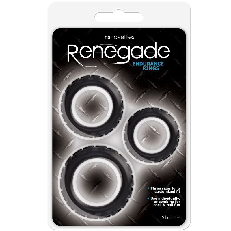 Набор Renegade Endurance Rings состоит из трех хорошо растяжимых эрекционных колец разных размеров, которые можно использовать в нескольких вариантах комбинаций. Кольца помогут Вам поддержать эрекцию и замедлить наступление эякуляции, тем самым значительно продлевая интимную близость. Они выполнены из качественного медицинского силикона и имеют особый ребристый рельеф. Силикон хорошо тянется, поэтому во время ношения колец Вы не будете испытывать дискомфорта. Используйте кольца в одиночку во время мастурбации, совместно с другой своей любимой игрушкой или в паре.