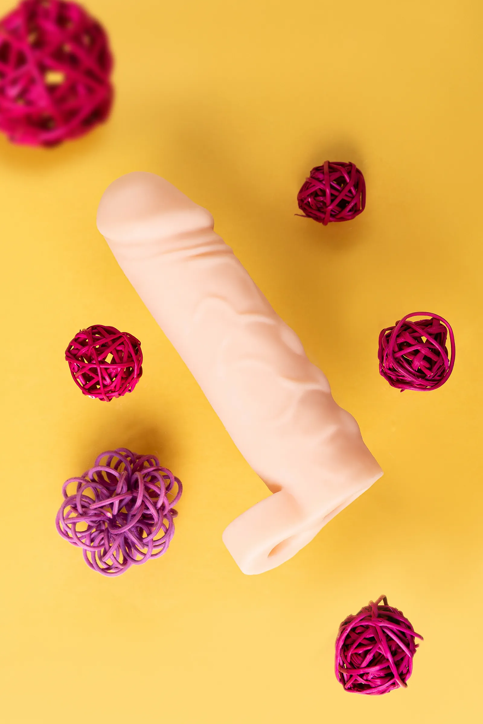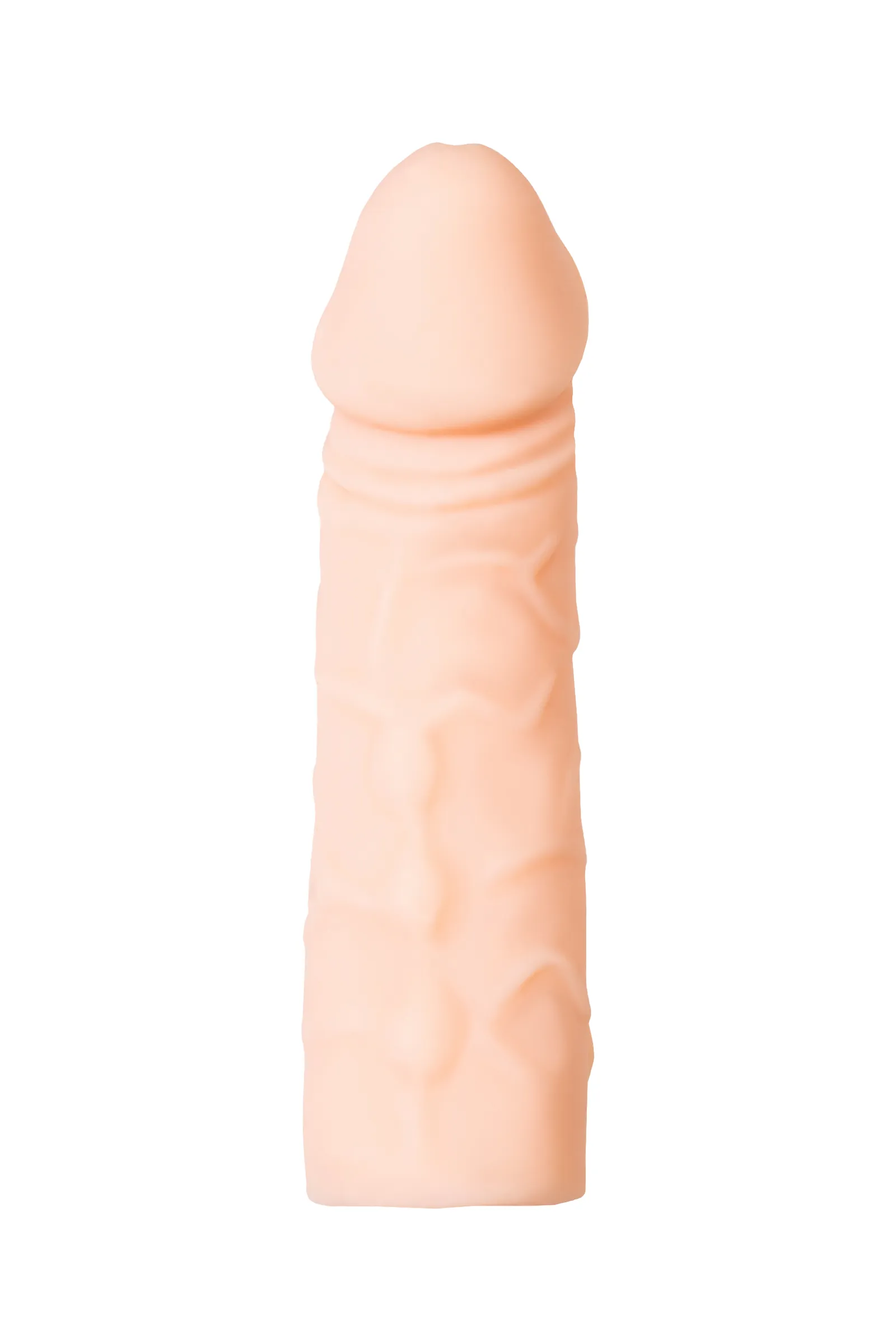 Эластичная насадка на пенис служит для увеличения размера полового члена в длину и продления полового акта. Удлиняющая насадка выполнена из нежного растяжимого материала, фиксируется с помощью кольца, которое надевается на мошонку. Объемная головка, выступающие складки и вены по всему стволу оказывают дополнительное воздействие на эрогенные зоны партнерши и ускоряют приближение оргазма. Рекомендуется использовать для проникновения лубриканты на водной основе. Насадка многоразовая, надевается на эрегированный пенис. С этой насадкой пенис увеличивается в объеме на 1,4 см, в длину на 3,5 см. Может содержать жирные следы.