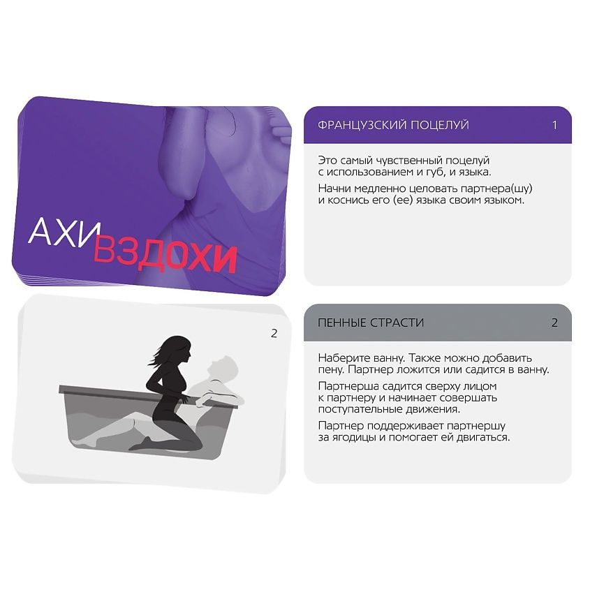 Этот набор позволит вам разнообразить сексуальную жизнь и добавить в неё немного перчинки. Вас ждут 20 карт из серии «Ахи-вздохи», которые включают в себя разные виды поцелуев и позы для секса. Начните прелюдию с поцелуев и плавно переходите к самому главному. В комплект также входят кружевная маска и вибропуля, которые можно использовать во время игры.