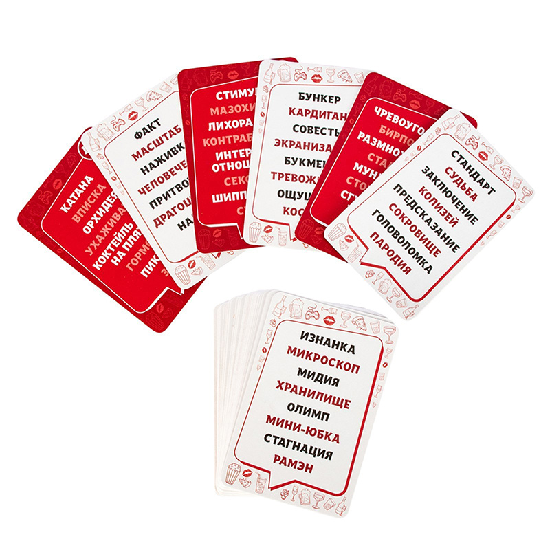 В наборе игры вы найдёте песочные часы, чтобы засечь время, и 800 слов. Это одна из самых популярных и незаменимых настольных игр предназначена для 2-8 игроков. Играй по-взрослому: в любом месте и в любой компании.