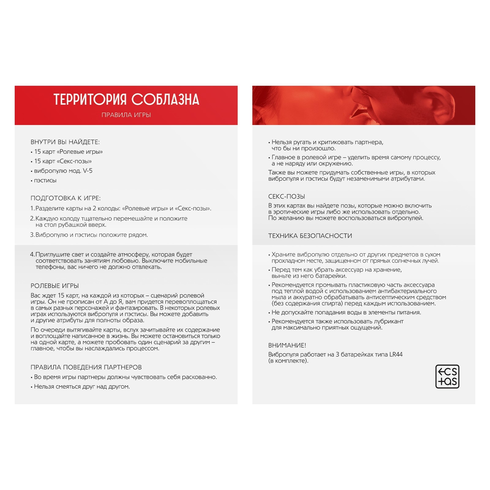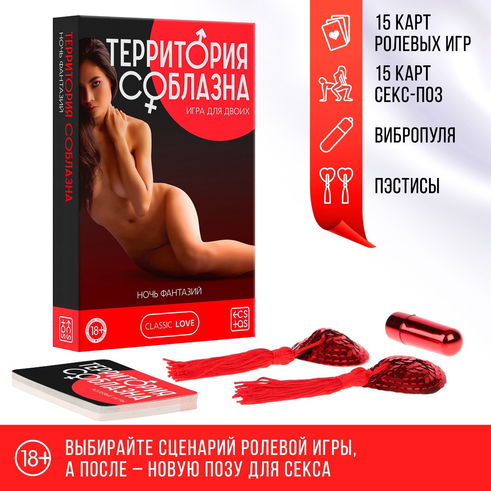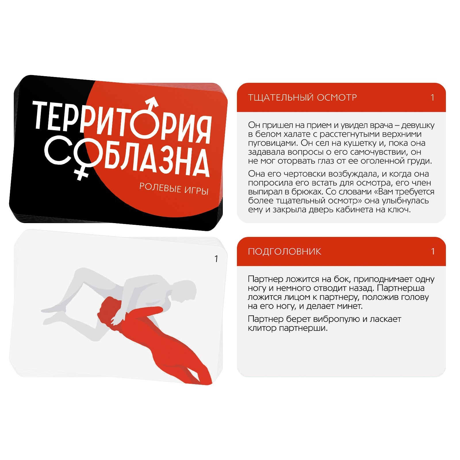 «Территория соблазна» – это серия эротических игр для двоих, в основе которой лежит акцент на раскрепощения. Разговоры, лёгкие прикосновения, пикантные фанты, прелюдия к сексу и постепенный переход к самому главному – сексу. Серия включает в себя наборы с аксессуарами, карточные игры, наборы кубиков и т.д.