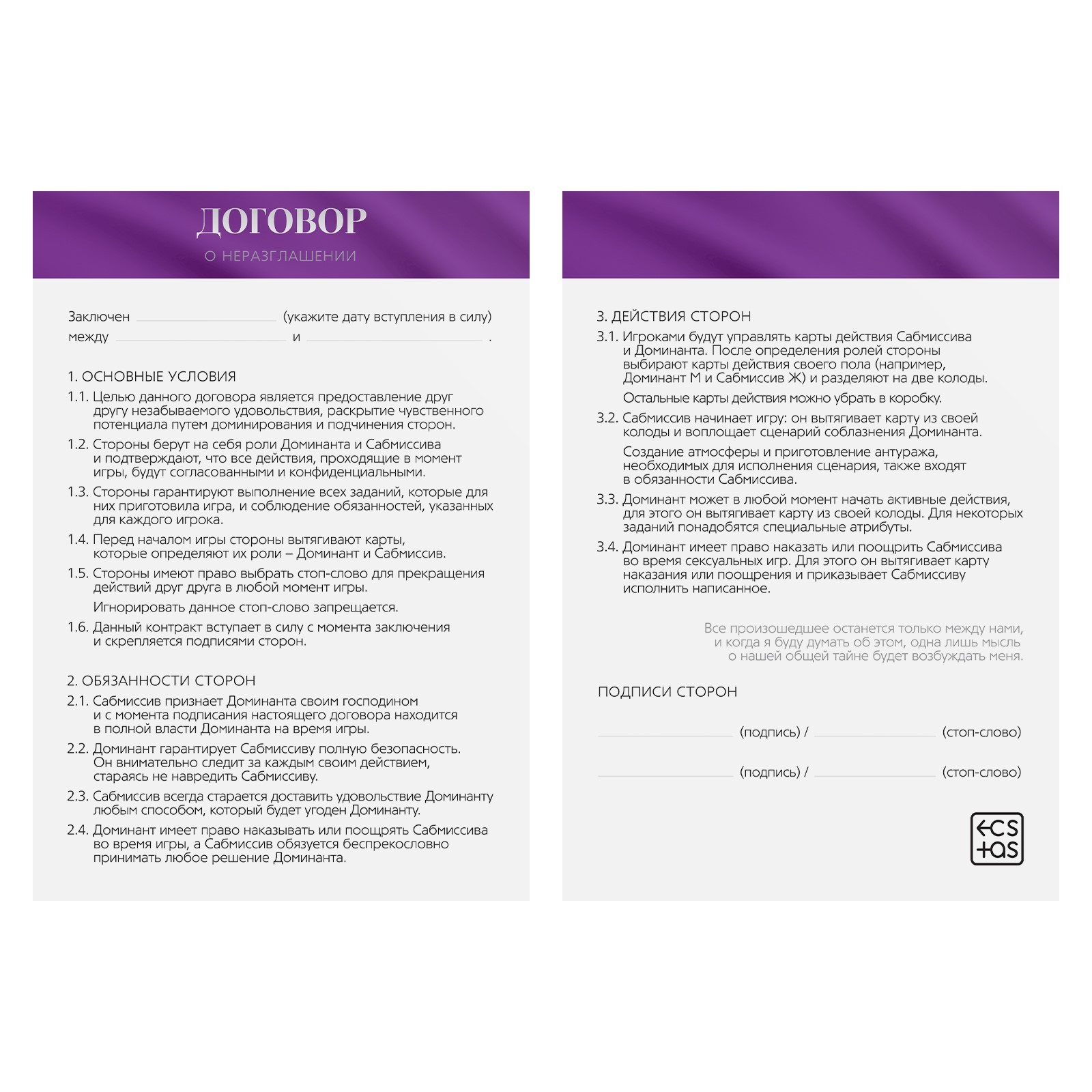 Хотите испытать новые эмоции? С этой игрой наказания будут более возбуждающими, а карты ролей помогут создать интригующую атмосферу. Вам нужно лишь расслабиться и полностью погрузиться в процесс. Подпишите договор о неразглашении и выберите желаемую роль. Один из вас будет доминирующим (доминантом), а другой — подчиняющимся (сабмиссивом). В комплекте есть карты наказаний для подчиняющегося, который ослушался своего хозяина. Доминирующий в любом порядке вытягивает карты из колоды наказания и следует инструкциям.