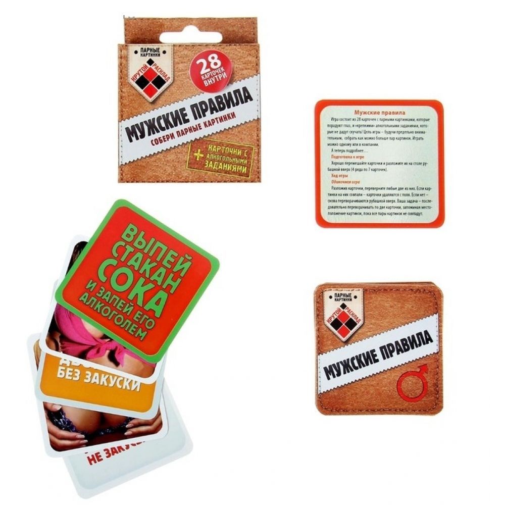 Карточная игра «Мужские правила» от российского производителя сувенирной продукции. Колода включает 28 карт с откровенными фотографиями женских прелестей. По правилам выигрывает тот, кто соберет больше парных картинок. Также карты сопровождаются алкогольными заданиями. Игра отлично подойдет для мужской компании и внесет разнообразие в привычные посиделки.