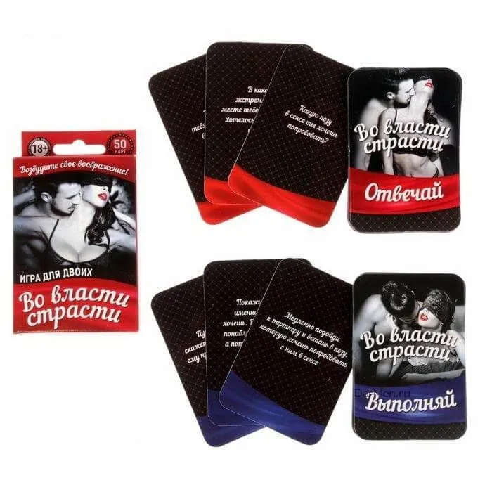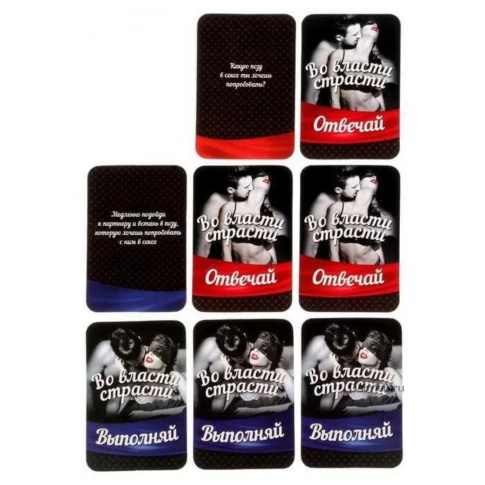 Игра с карточками "Во власти страсти" поможет партнерам раскрепоститься и познать новые грани удовольствия. В колоде Вы найдете карточки "Отвечай" и "Исполняй", которые следует положить в две стопки и по очереди вытягивать. Если Вы будете честно отвечать на пикантные вопросы, то Вас и Вашего партнера ждут невероятные признания и страстные ласки. Открывшись друг другу, Вы разнообразите свои любовные игры и станете лучше понимать желания друг друга, что укрепит Ваши отношения и поможет достигнуть гармонии.