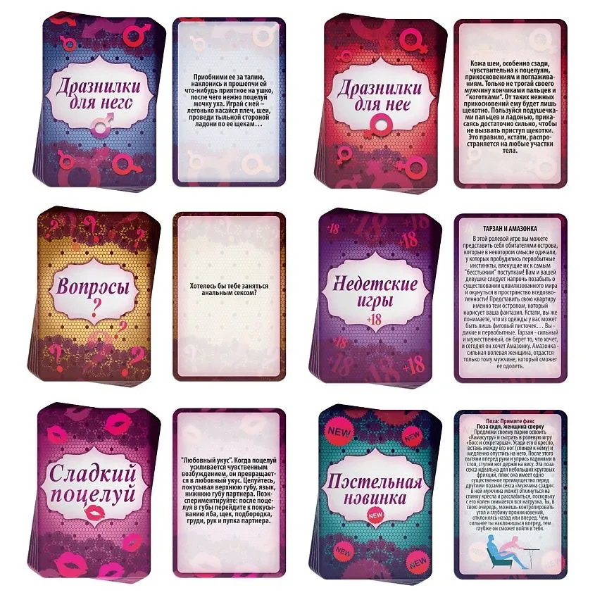 В процессе игры вы ответите на интимные вопросы, освоите разные способы поцелуев, выполните пикантные задания, поиграете в ролевые игры… Словом, вас ожидает то, о чём вы даже не мечтали! Кубики можно использовать отдельно в качестве прелюдии к сексу.
