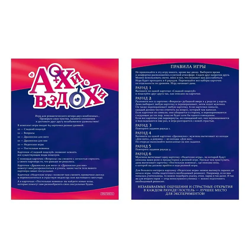 «Ахи-вздохи» — это серия эротических игр для двоих, которая включает невероятное множество пикантных заданий-фантов для него и для неё. Здесь найдутся игры в формате вопрос-ответ, ролевые развлечения и необычные позы для секса. Игры серии «Ахи-вздохи» подойдут для тех, кто только начал романтические отношения и хочет узнать друг друга поближе, а также для пар, союз которых длится уже долго.