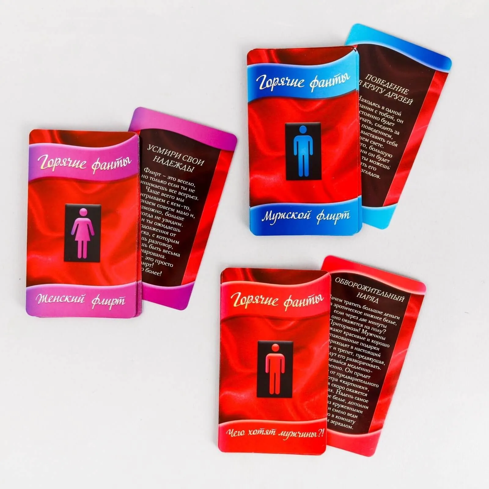 Игра "Уроки флирта" поможет паре раскрепоститься и лучше понять свои желания. В наборе Вы найдете 15 карт "Мужской флирт", 15 карт "Женский флирт" и 10 карт "Чего хотят мужчины", в которых представлены задания, выполние которых принесет удовольствие обоим партнерам. Эта игра научит Вас лучше понимать настроение собеседника и его тайные желания, связанные с Вами. Задания из набора позволят вам открыться перед партнёром с новой стороны, а ваши чувства будут крепнуть с каждым днём!