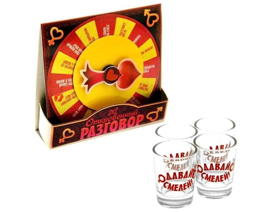 Пьяная рулетка «Откровенный разговор» станет отличным поводом собраться вместе и весело, а главное раскрепощено провести время в компании друзей. Всё просто - запаситесь отличным настроением, алкоголем и желанием узнать друг о друге чуть больше. Раскручивайте стрелку на рулетке и выполняйте задания. В комплекте к этой замечательной игре идут четыре рюмочки, так что комплект для вечеринки готов!