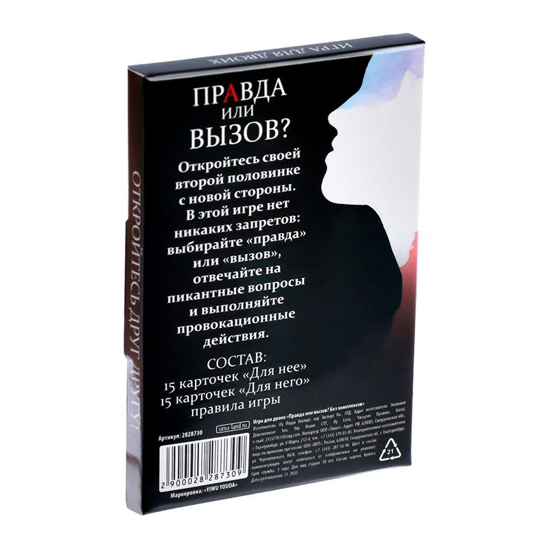 Узнайте секреты друг друга! Игра для пар «Правда или действие? Без комплексов» поможет вам открыться своей половинке с новой стороны. В этой игре нет проигравших и победителей. Просто наслаждайтесь каждой минутой, проведённой рядом друг с другом!