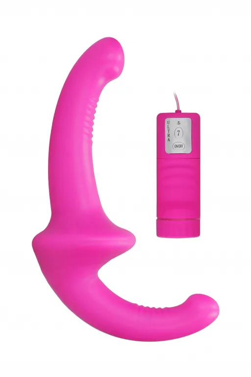 Silicone Strapless Strapon – женский безремневой страпон с вибрацией и выносным пультом управления. Он состоит из двух почти одинаковых частей, различающихся только размером и степенью наклона к основанию. Оба конца имеют небольшую выпуклую головку и ребристый участок на внутренней поверхности. Основа страпона изготовлена из упругой тепрмопластичной резины, а сверху он покрыт медицинским силиконом, который не содержит фталатов и совершенно безопасен для здоровья.