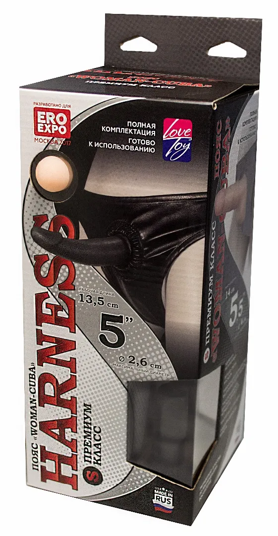 Трусики из эластичной кожи с резиновым кольцом для насадок. Дополнен пряжками для регулировки размера и двумя насадками. Одна насадка из материала Неоскин- имеет мощную присоску. Вторая насадка из полужесткого материала (подходит для анального проникновения). Характеристика: длина насадок- 13,5 см, диаметр насадок- 3 и 4 см. Упаковка: картонная коробка с принтом.