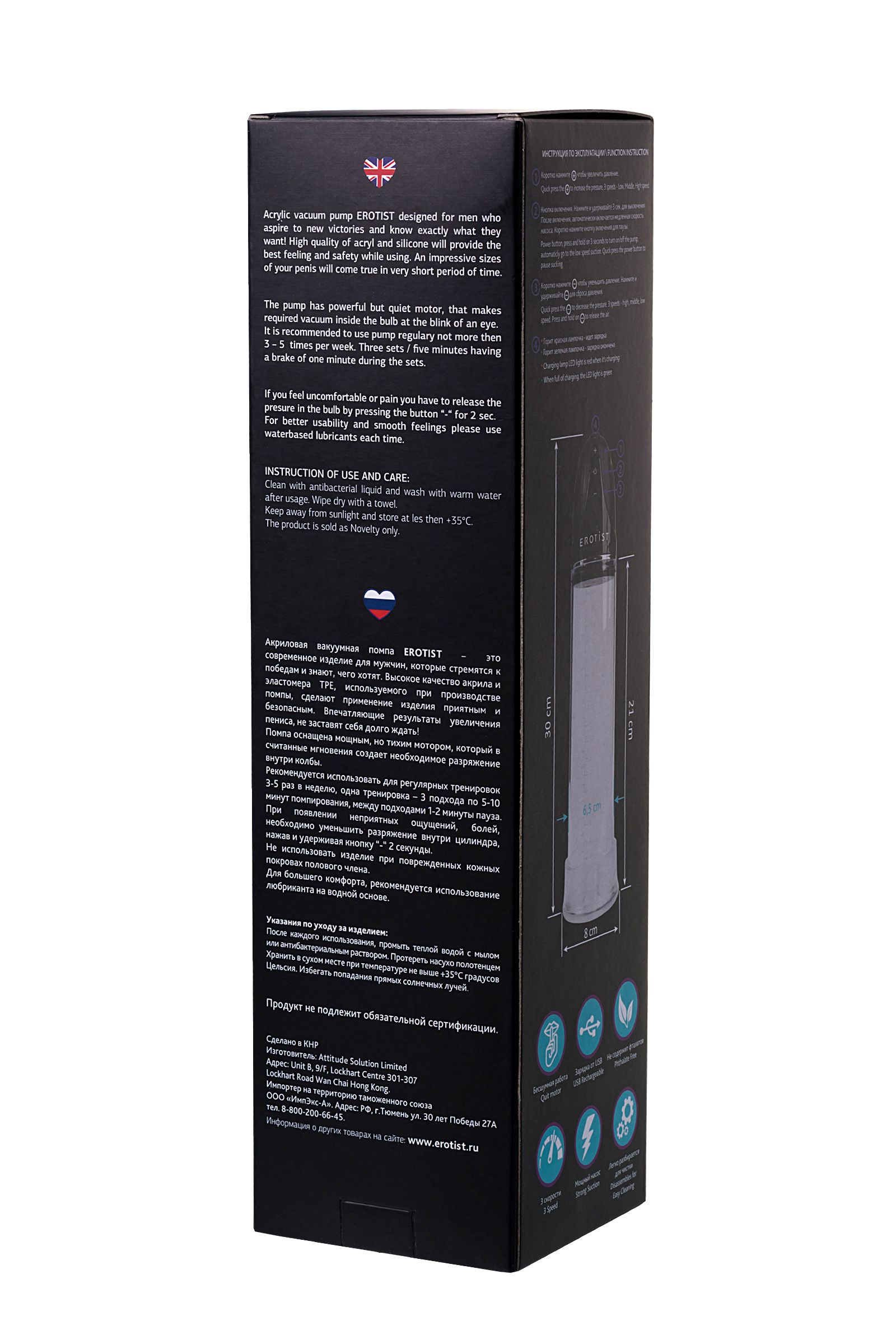 Массажер для мужчин, которые стремятся к победам Помпа повышает качество эрекции и стабилизирует потенцию, улучшает кровообращение, тонус сосудов и эластичность тканей пениса. При регулярных тренировках увеличивает размер полового члена. Кратковременный результат заметен после первого применения.     Помпа оснащена мощным электрическим насосом, который в считанные мгновения создает внутри колбы разрежение, оптимальное для тренировки.     Бесшумная работа мотора не отвлекает от процесса тренировки.     Мощный насос увеличивает результативность занятий.     3 скорости откачки воздуха позволяют выбрать наиболее комфортный режим.     Высокое качество акрила и эластомера делает применение изделия приятным и безопасным.     Зарядка от USB помогает всегда оставаться в строю.     Отсутствие сложных элементов позволяет легко разбирать помпу для чистки.
