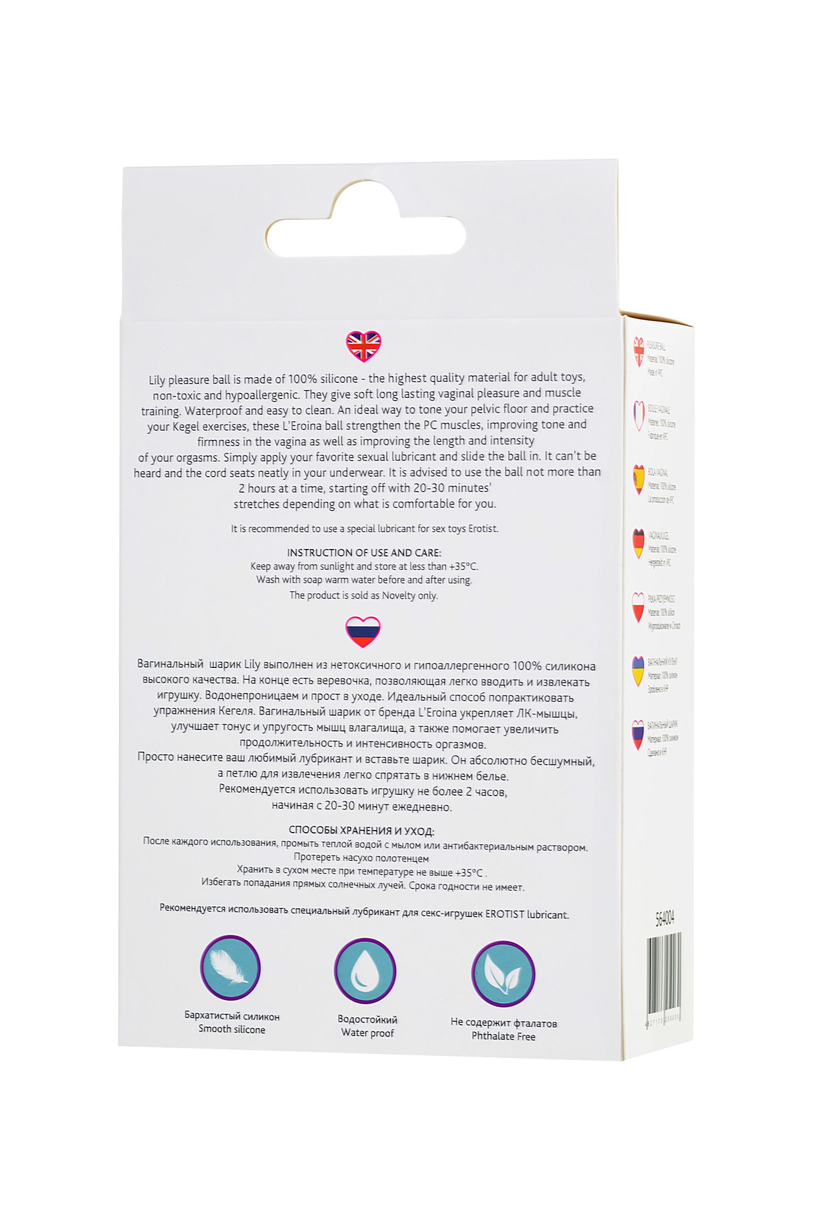 Вагинальный шарик Lily выполнен из нетоксичного и гипоаллергенного 100% силикона высокого качества. На конце есть веревочка, позволяющая легко вводить и извлекать игрушку. Водонепроницаем и прост в уходе. Идеальный способ попрактиковать упражнения Кегеля. Вагинальный шарик от бренда L’Eroina укрепляет ЛК-мышцы, улучшает тонус и упругость мышц влагалища, а также помогает увеличить продолжительность и интенсивность оргазмов. Просто нанесите ваш любимый лубрикант и вставьте шарик. Он абсолютно бесшумный, а петлю для извлечения легко спрятать в нижнем белье. Общий длина: 10,5 см Диаметр: 3,1 см Вес:35 гр.