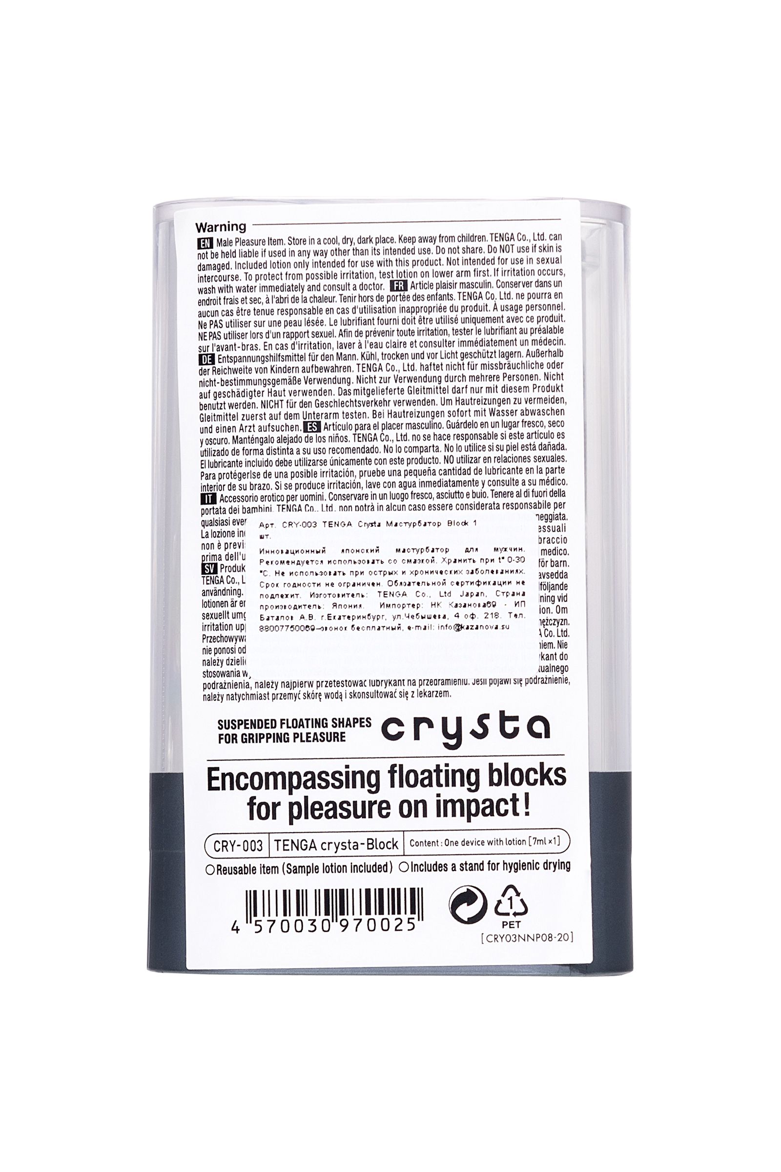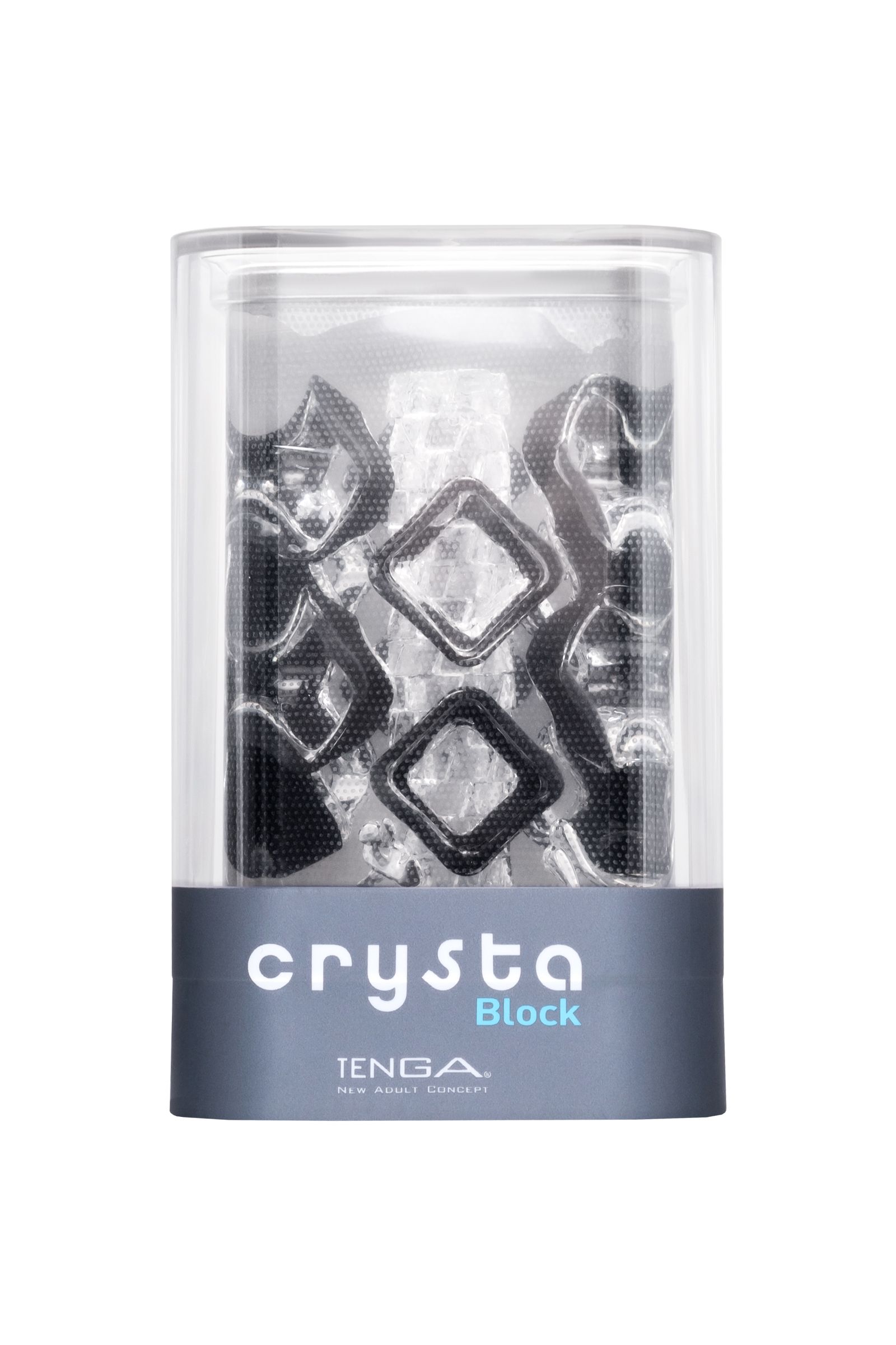 Функциональная форма и футуристичный дизайн делают коллекцию Tenga Crysta настоящим произведением искусства среди мужчских мастурбаторов. В динейке представлены три мастурбатора с различными рельефами. Текастура Block состоит из множества кубов разного диаметра, расположенных вдоль узкого входного канала в хаотичном порядке.