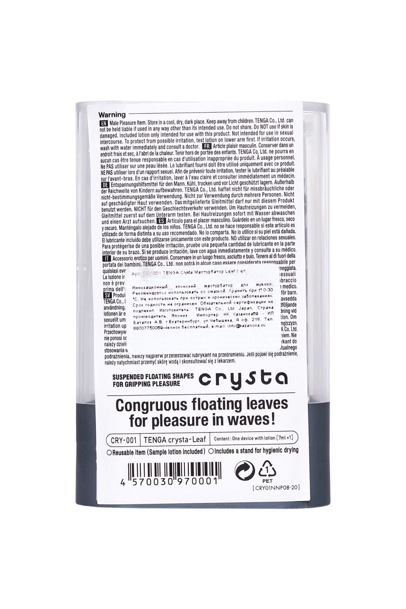 Функциональная форма и футуристичный дизайн делают коллекцию Tenga Crysta настоящим произведением искусства среди мужчских мастурбаторов. В динейке представлены три мастурбатора с различными рельефами. Текастура Leaf состоит из множества ребер разной ширины, расположенных вдоль узкого входного канала.