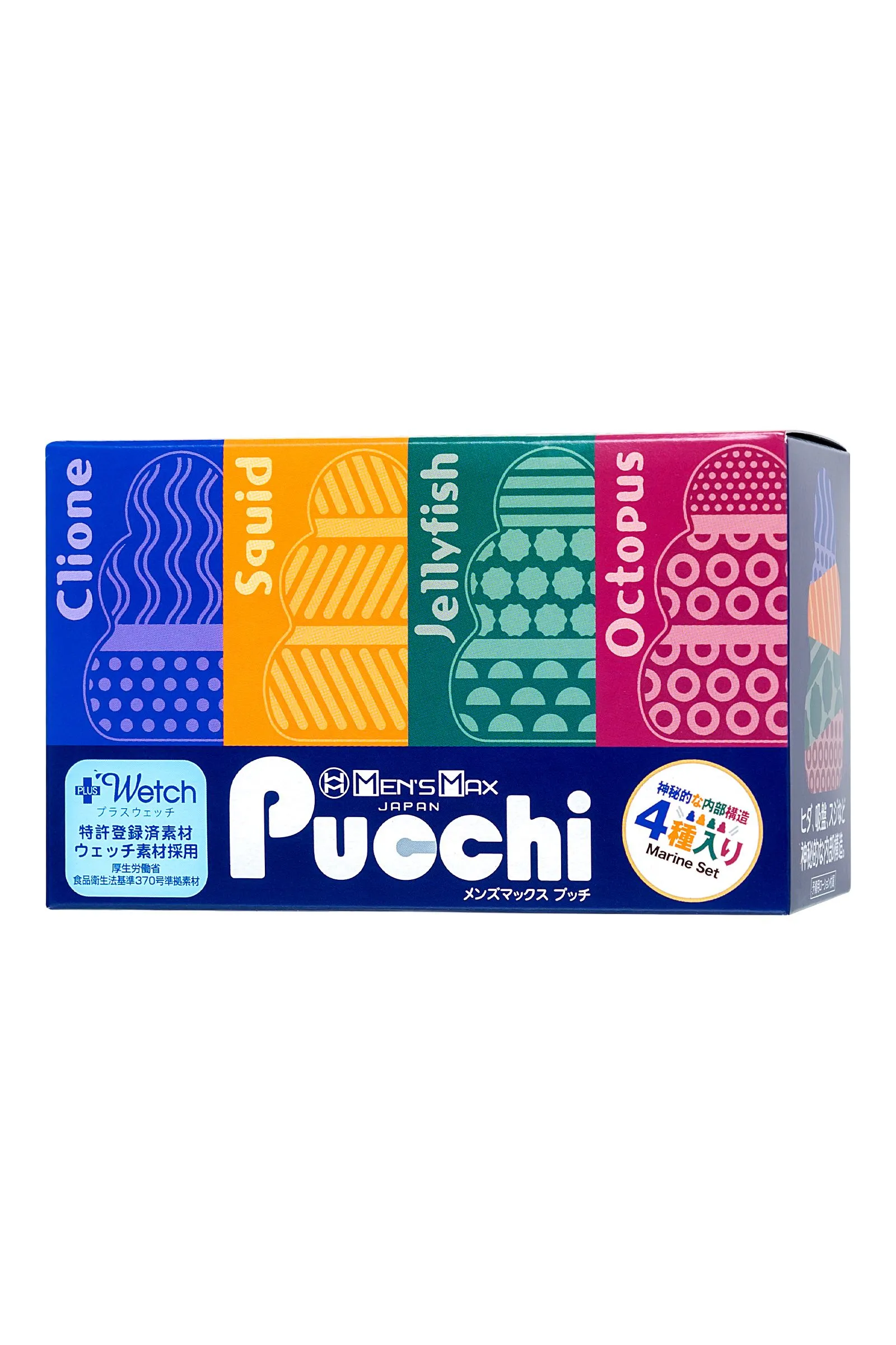 Обновленные карманные мастурбаторы MensMax Pucchi Set Box Marine в одном наборе. Эти секс-игрушки имеют увеличенный размер, улучшенную эластичность, более четкий рельеф, и выделяют еще больше смазки – берите мастурбатор с собой куда угодно. Все что вам нужно – это MensMax Pucchi и немного воды. Самоувлажняющийся мастурбатор невероятно удобен в командировках, путешествиях и в повседневной жизни. Благодаря запатентованной японской технологии, инновационный материал +Wetch при взаимодействии с водой выделяет густой гель, усиливающий скольжение. Даже во время длительного массажа пениса гель не скатывается и не высыхает. Достаточно добавить немного воды, чтобы испытать полный спектр эмоций от интимного удовольствия. Многоразовая непрозрачная упаковка с замочком-клапаном служит мешочком для хранения. Упругий, но эластичный материал подходит для мужчин с любыми размерами пениса. Материал игрушки тактильно приятный и быстро принимает температуру тела. Чтобы усилить ощущения, добавьте теплую воду и наслаждайтесь температурными играми. MensMax Pucchi производят на новейшем оборудовании в Японии, что гарантирует качество и безопасность использования. В наборе 4 мастурбатора Pucchi с морскими рельефами: Clione, Octopus, Squid и Jellyfish. Каждая игрушка представляет собой мягкую трехъярусную елочку с одним отверстием. Внешняя сторона гладкая и нежная, а внутри разнообразные комбинированные рельефы, которые обеспечивают дополнительный массаж пениса, и особенно ярко ощущаются при стимуляции головки. Чем глубже проникновение, тем ощутимее стимуляция. Когда под рукой целый набор мастурбаторов – легко подобрать нужный рельеф под настроение, или использовать несколько игрушек одновременно. Инструкция: Достаньте мастурбатор из упаковки и налейте в него немного воды (чайную ложку). Старайтесь не намочить внешнюю сторону игрушки, чтобы смазка не мешала вам в процессе. Распределите образовавшийся гель по внутренней поверхности девайса. Начните с массажа головки, так вы сможете получить максимальное наслаждение от рельефа и настроиться на нужный лад. Совершайте вращательные движения по часовой стрелке или против нее. Для предварительных ласк партнерши выверните мастурбатор наизнанку и наденьте на пальцы. После игр промойте Pucchi водой или средством для очистки игрушек. Когда израсходуете смазку мастурбатора, выбирайте лубриканты на водной основе.