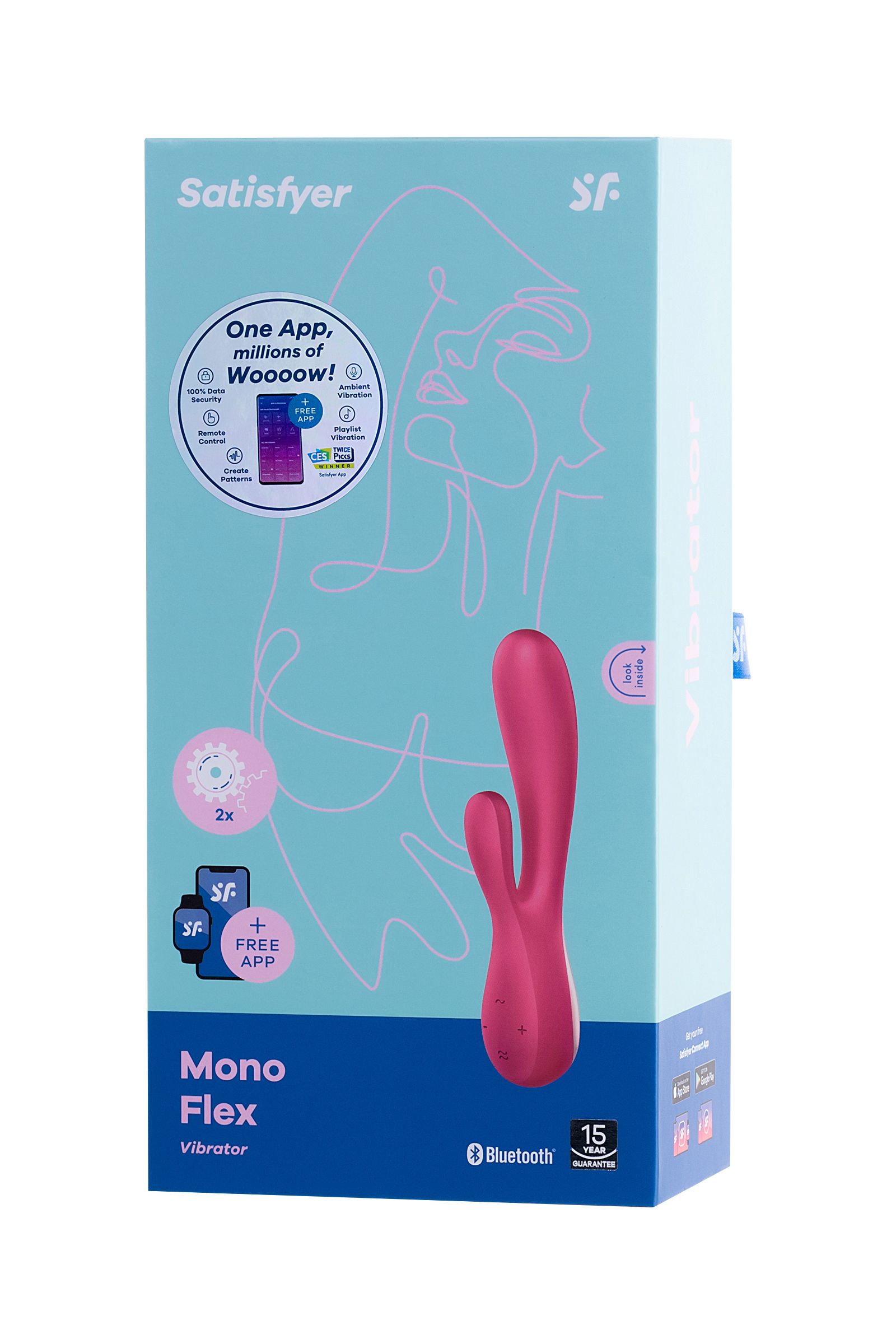 Satisfyer Mono Flex имеет очень эластичные вагинальный и клиторальный отростки. Округлая головка способствует более комфортному проникновению и обеспечивает более яркую стимуляцию. Вибромассажер обладает сверхмощной глубокой вибрацией. Особенность игрушки состоит в том, что она управляется не только с помощью кнопок на корпусе, но и с помощью телефона.