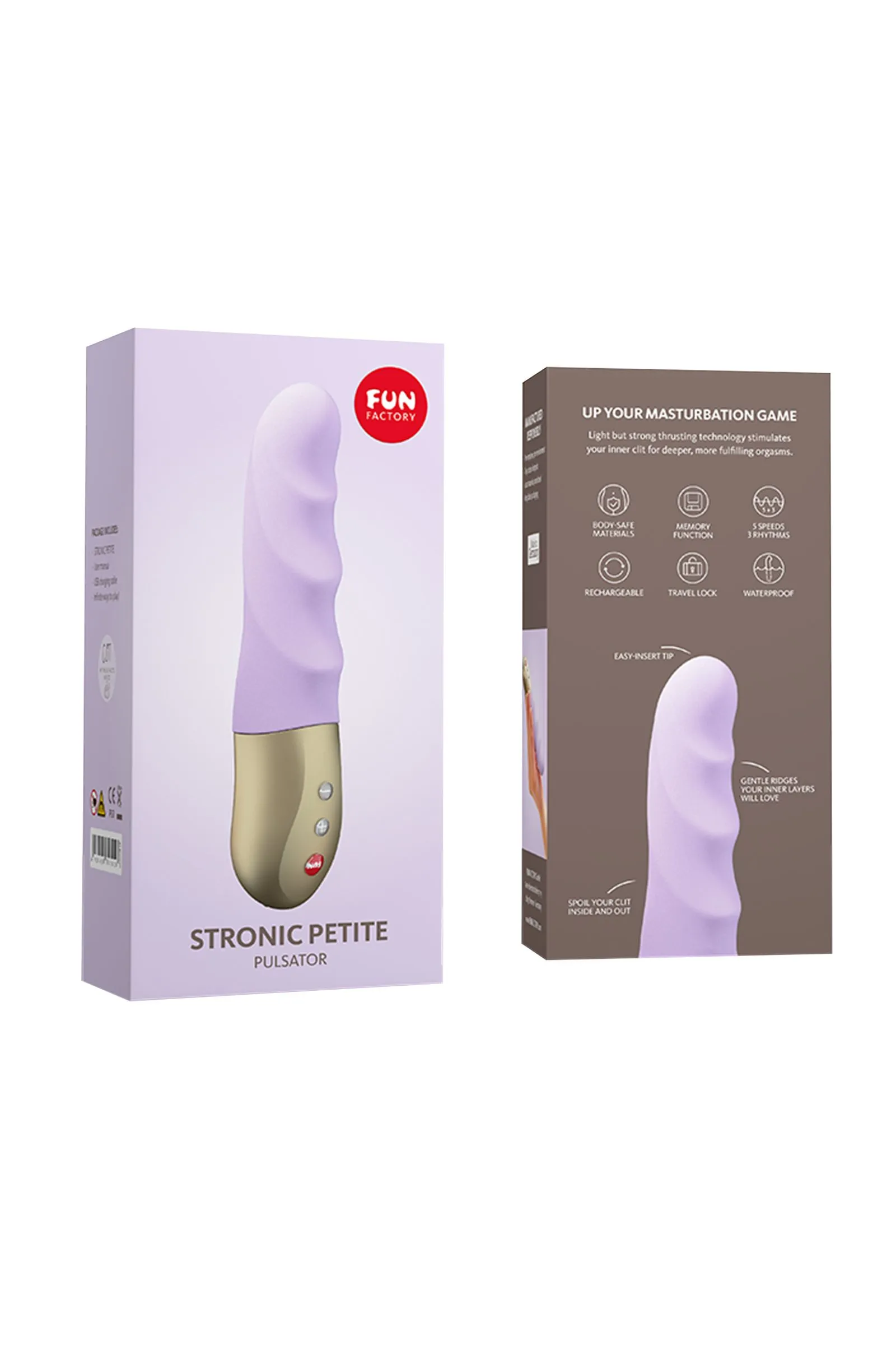 Мини-пульсатор STRONIC PETITE лиловый Fun Factory Новое слово в женском оргазме, независимо от возраста и темперамента – пульсатор Stronic Petite от немецкого производителя Fun Factory. Размер мини для концентрированного удовольствия и максимального наслаждения. Тот самый случай, когда размер не имеет значения – в изящном пульсаторе Stronic Petite спрятаны мощный мотор и механизм поступательно-возвратных действий. Самый легкий и небольшой пульсатор, при этом мощный и впечатляющий. В отличие от простых вибраторов Stronic Petite имитирует фрикции, совершаемые партнером, оказывая пульсирующее давление на все самые чувствительные зоны. Ваша незаменимая игрушка-антистресс, которая будет доставлять вам удовольствие без помощи ваших рук – стоит ввести во влагалище и зажать между ног, или устроить его на подушке. А руки смело пускайте в ход для самых вкусных ласк. Кроме того Stronic Petite может легко стать дирижером вашей прелюдии – приложите его к клитору и оркестр мурашек и чувственных ощущений образует симфонический путь к оргазму. Тактильно приятное ощущение “антистресс” возникает, когда вы прикасаетесь к мини-пульсатору Stronic Petite. Бархатистый медицинский силикон премиального класса – удивительно нежный и упругий. Никаких швов и посторонних запахов – эстетическое удовольствие от взаимодействия. Идеальная форма с плавными изгибами и волнообразным рельефом, которая будет стимулировать переднюю стенку влагалища и вход в него. Комфортное управление 3 режимами и 5 скоростями с помощью кнопок вперед и назад на удобной ручке. Представьте сколько различных вариаций для удовольствия вам доступно! А для путешествий предусмотрена функция блокировки клавиш. Водонепроницаемый, чтобы вы могли испытать широкий спектр чувств и ощущений от использования в ванной и душе. Магнитное зарядное устройство – USB-кабель Время полной зарядки 6 часов Время работы 3 часа Лиловый цвет – тренд современности Общая длина 17 см Рабочая длина 11 см Диаметр от 2,5 до 3,5 см Использовать только с лубрикантами на водной основе Производитель Германия Гарантия 2 года