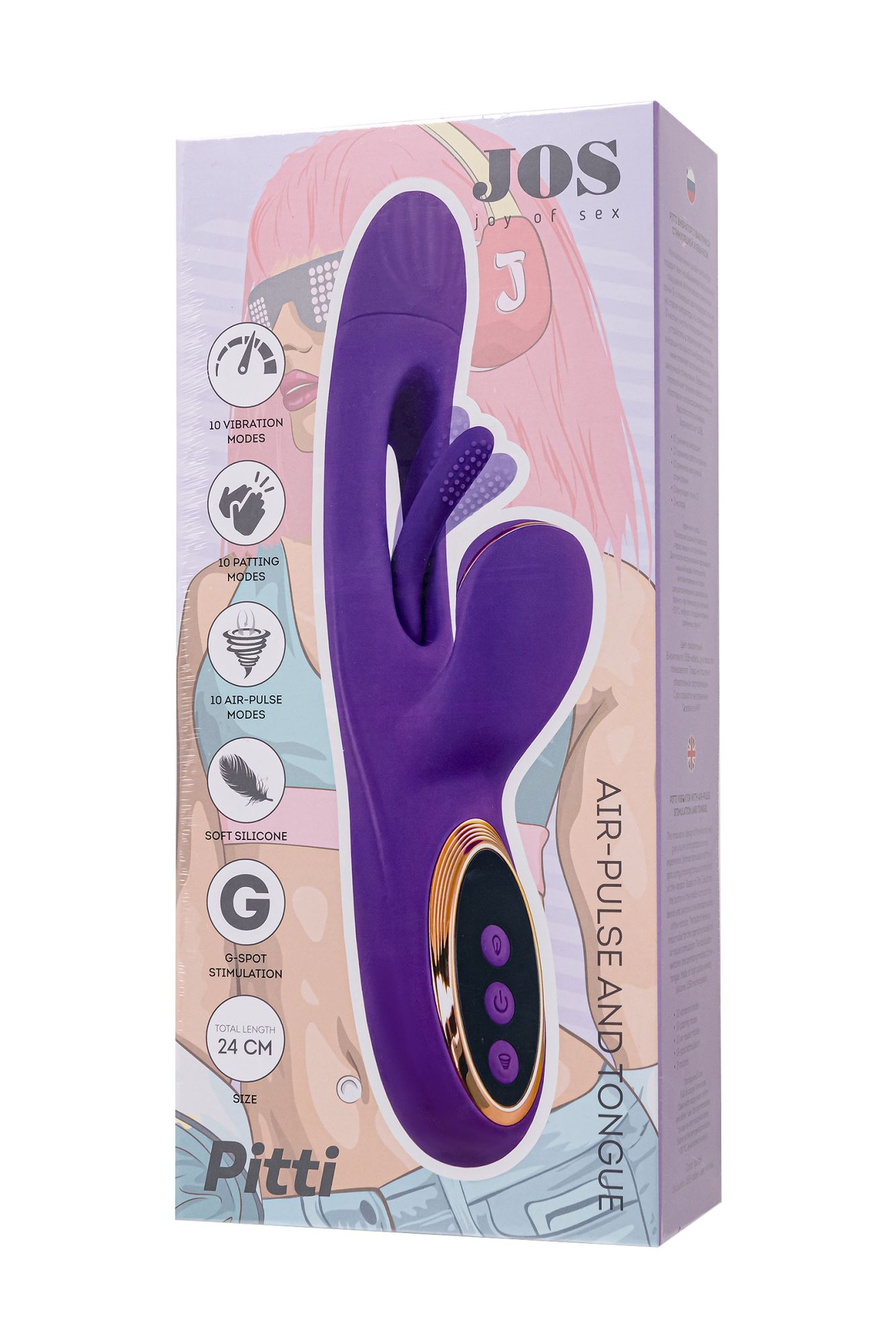 Погрузитесь в мир инновационных ощущений с вибратором PITTI от самого необыкновенного бренда JOS! Этот невероятный технологичный дизайн поднимет стимуляцию точки G на абсолютно новый уровень. Двигающийся язычок внутри вагинальной части точечно вибрирует непосредственно на зоне G, погружая вас в водоворот удовольствия. А клиторальный отросток в это время может ласкать вас вакуумными волнами воздушной пульсации. Тройное удовольствие гарантирует оргазм с максимальным уровнем экстаза. Управляйте своим наслаждением с легкостью! Три кнопки на основании вибратора контролируют каждый аспект удовольствия. Серединная кнопка включает устройство и переключает режимы основного вибратора. Кнопки ниже управляют режимами клиторального отростка. Верхняя кнопка изменяет режимы работы язычка. PITTI выполнен из высококачественного бархатистого силикона, обеспечивая максимальный комфорт. Заряжается от USB, что делает использование еще более удобным. Простое управление тремя кнопками гарантирует, что каждая функция будет под вашим контролем. Дизайн игрушки выполнен в насыщенном фиолетовом цвете с золотыми вставками. Головка погружного ствола имеет диаметр 3,3 см, а рабочая длина кролика составляет 13,5 см. Изготовленный из высококачественного бархатистого силикона, PITTI легко заряжается от USB, что делает его современным и практичным в использовании. Идеально гладкое и безопасное покрытие обеспечит вашей коже комфорт. Позаботьтесь о правильном хранении и уходе за PITTI, чтобы он всегда оставался вашим верным спутником в мире наслаждения. Используйте только водные лубриканты. После каждого использования промойте его мыльной водой и дезинфицируйте антибактериальным спреем, чтобы сохранить его гигиеничность и продлить его срок службы. Технические характеристики: 10 режимов вибрации 10 режимов вакуумной стимуляции 10 режимов работы язычка 3 мотора Стимуляция точки G Общая длина 24 см Рабочая длина 13,5 см Диаметр 3,3 см Материал - силикон, ABS-пластик Цвет - фиолетовый