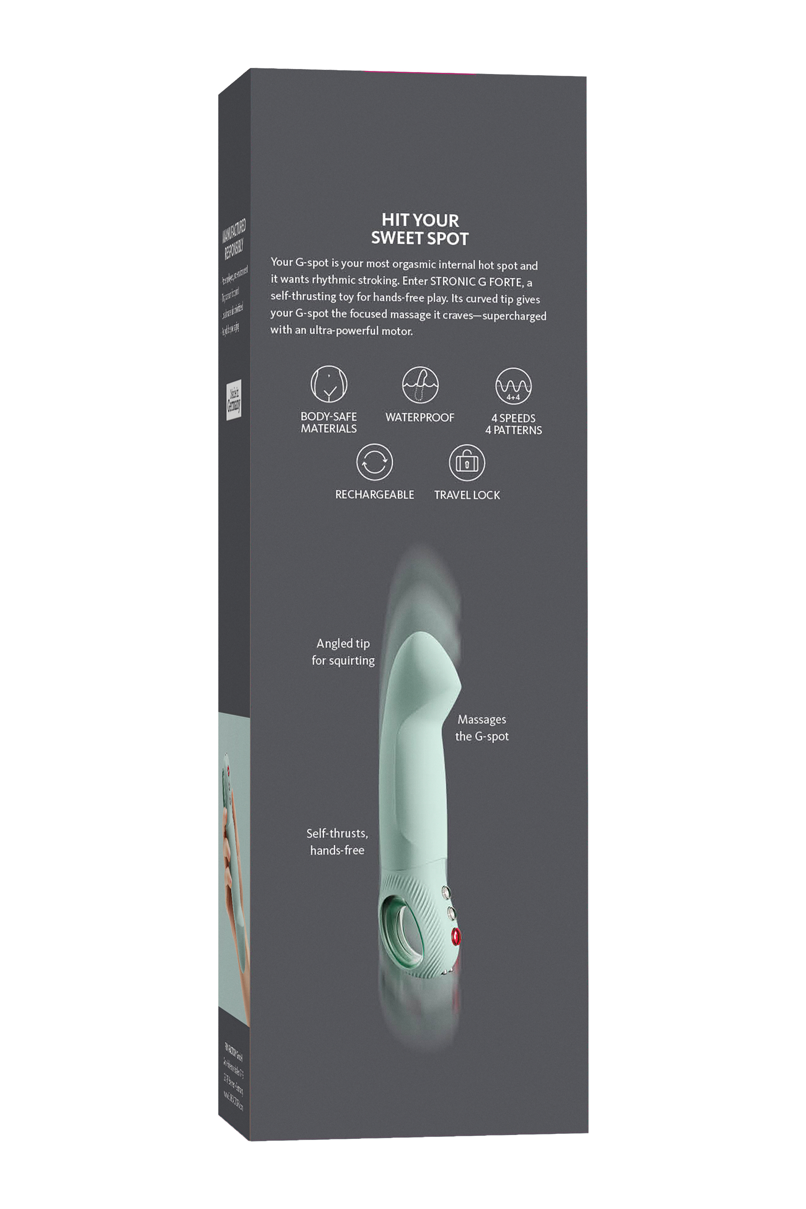 Откиньтесь назад и наслаждайтесь без помощи рук – пульсатор Stronic G Forte от Fun Factory самостоятельно выполняет фрикционные движения, обеспечивая интенсивную стимуляцию, которая заставит ваше тело трепетать от удовольствия. С его роскошным дизайном, идеально изогнутым для максимальной стимуляции точки G, и на 40% большей мощностью по сравнению с предшественником, Stronic G Forte гарантирует незабываемые моменты экстаза. Позвольте этой инновационной секс-игрушке подарить вам новое измерение удовольствия, освобождая ваши руки и ум для полного расслабления и наслаждения. Основные преимущества: Свобода рук: Stronic G Forte самостоятельно двигается вперед и назад, освобождая ваши руки для дополнительных ласк или полного расслабления. Запатентованная технология пульсатора от Fun Factory обеспечивает непревзойденные ощущения. Совместное удовольствие: Используйте пульсатор во время орального секса или других сексуальных игр с партнером, усиливая ощущения и создавая незабываемые моменты. Максимальное наслаждение: Благодаря мощным толчкам и эргономичному дизайну, Stronic G Forte обеспечивает глубокую и интенсивную стимуляцию точки G, приводя к взрывным оргазмам. На 40% мощнее оригинальной версии, Stronic G Forte гарантирует глубокое и удовлетворяющее проникновение. 4 скорости и 4 программы движений позволяют настроить пульсатор под ваши предпочтения. Уникальный дизайн: Идеально изогнут для стимуляции точки G, обеспечивая максимальное удовольствие. Стильная рукоятка-кольцо Stronic G Forte не только красива, но и очень практична. В ней есть отверстие для пальцев, которое обеспечивает надежное сцепление с пульсатором. Изготовлен из гипоаллергенного и непористого силикона, безопасного для тела. Каждая деталь высокого качества, от кнопок до бархатисто-мягкого силикона, который невероятно ощущается на вашем теле. Идеален для путешествий: Компактный и удобный пульсатор легко брать с собой в поездки, благодаря функции дорожной блокировки и надежной упаковке. Перезаряжаемый: Работает 2-3 часа на одном заряде, полный цикл зарядки – 6 часов. Размеры: Длина 19 см, диаметр 4 см, вес 216 г. Немецкое качество. Сделано в Германии. 2 года гарантии от производителя. Медицинский силикон, цвет зеленый шалфей Предупреждение: Не предназначен для анального использования. Может быть вреден для людей с кардиостимуляторами. Подарите себе или своему партнеру невероятные ощущения с пульсатором Fun Factory Stronic G Forte. Изысканный дизайн и непревзойденная функциональность делают его идеальным выбором для тех, кто ценит качество и инновации в интимных играх.