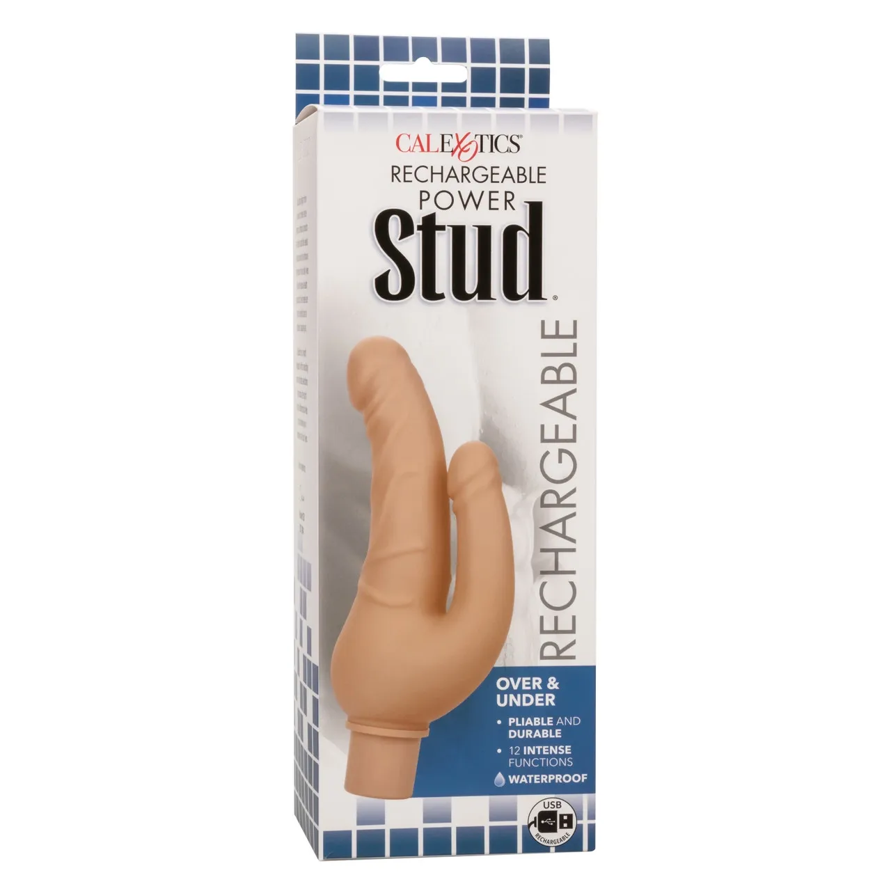 Power Stud Over & Under - мощный двойной реалистичный фаллоимитатор с вибрацией. Имитация имеет 2 ярко выраженных округлых головки, рельефное покрытое венками тело. Мощный двигатель, расположенный на кончике массажера, производит глубокие, сильные вибрации и обеспечивает 12 режимов вибрации.